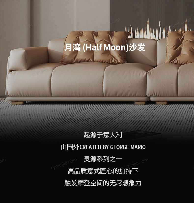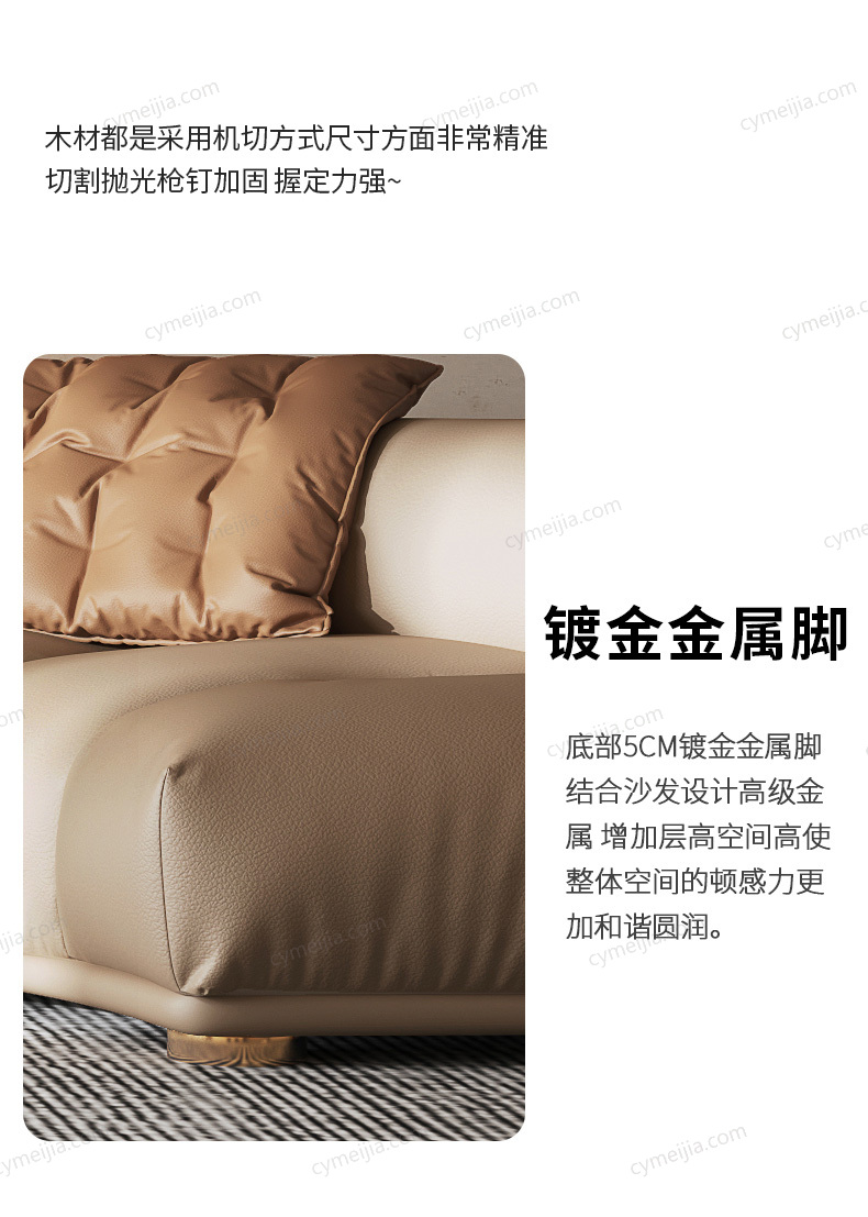 | 产品材质 : | 仿真皮+羽绒靠包+高密度海绵+俄罗斯落叶松实木框架+镀金脚 |