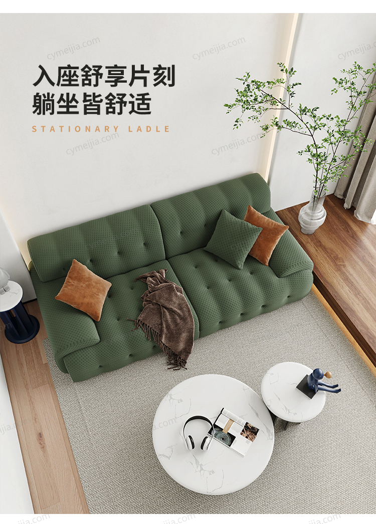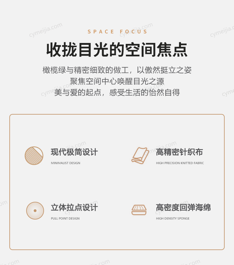 | 产品材质 : | 针织布艺+高密度海绵+俄罗斯落叶松实木框架 |