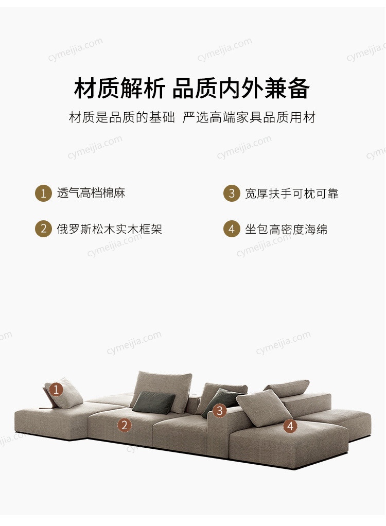 | 产品材质 : 高档棉麻+高密度海绵+俄罗斯落叶松实木框架 | 包件数 : 9 | 包装体积(m3) : 4.80 | |