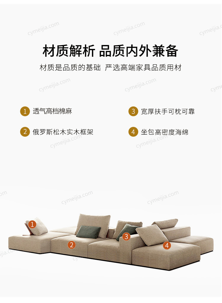 | 产品材质 : 高档棉麻+高密度海绵+俄罗斯落叶松实木框架 | 包件数 : 4 | 包装体积(m3) : 3.60 | |