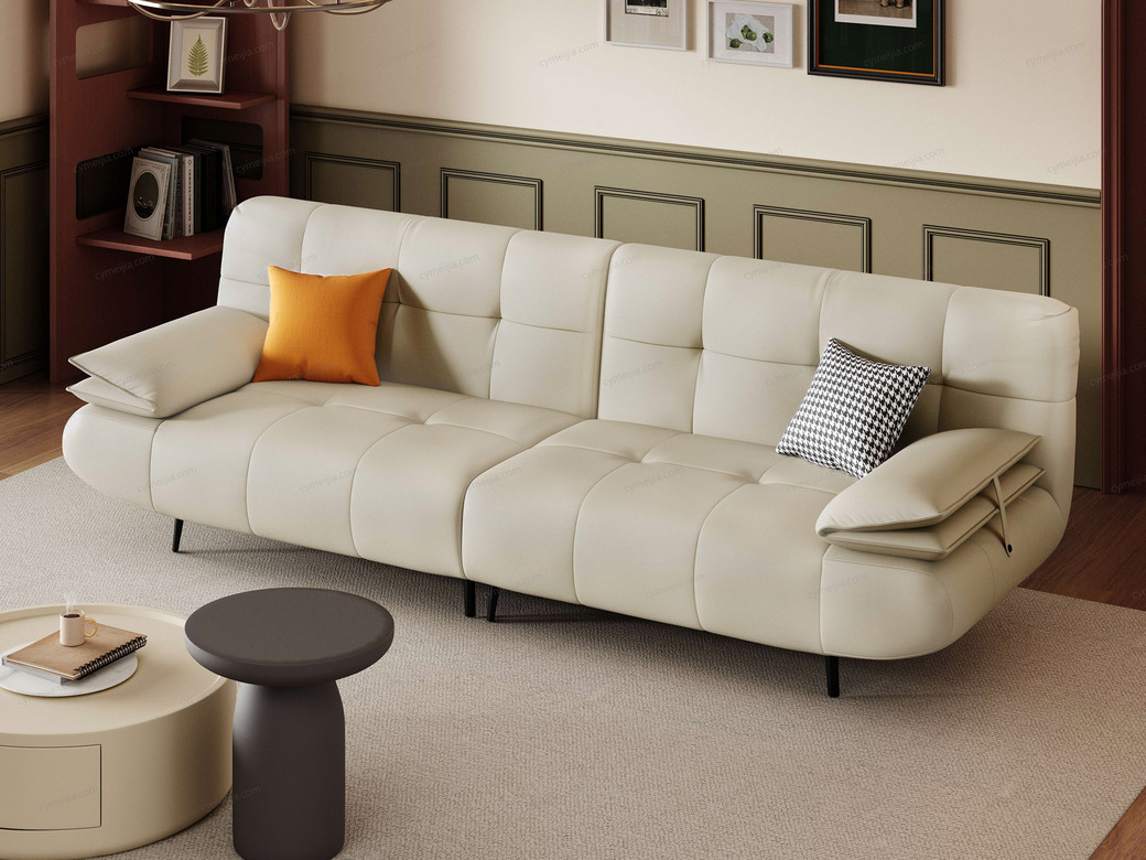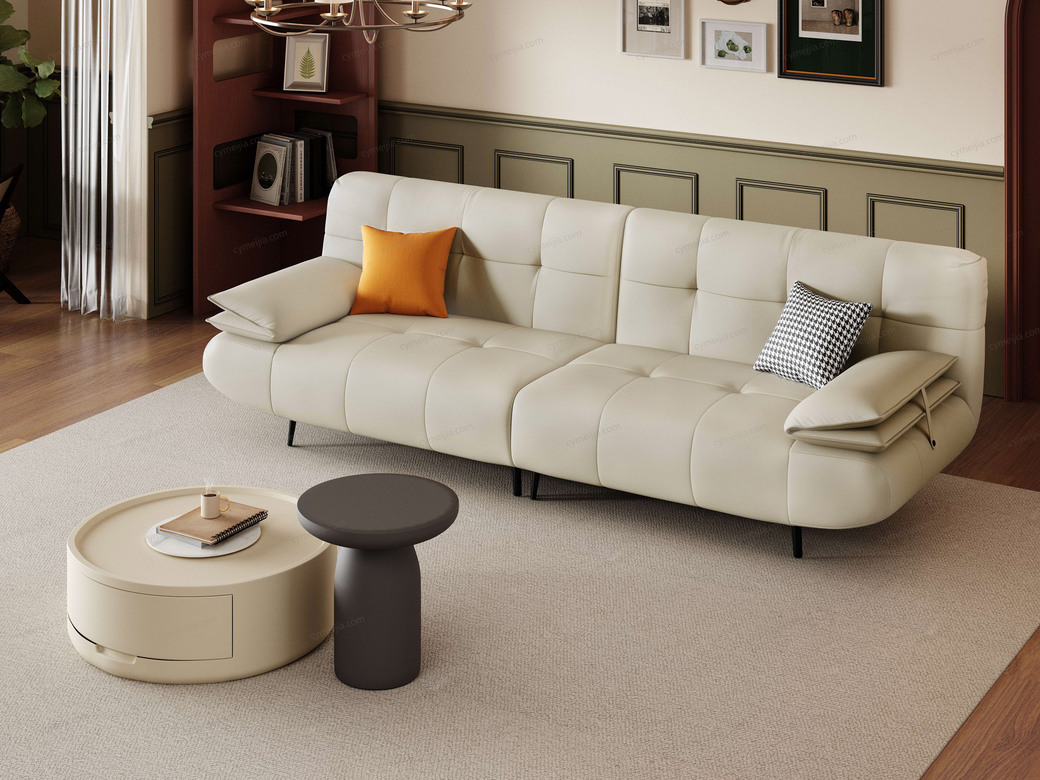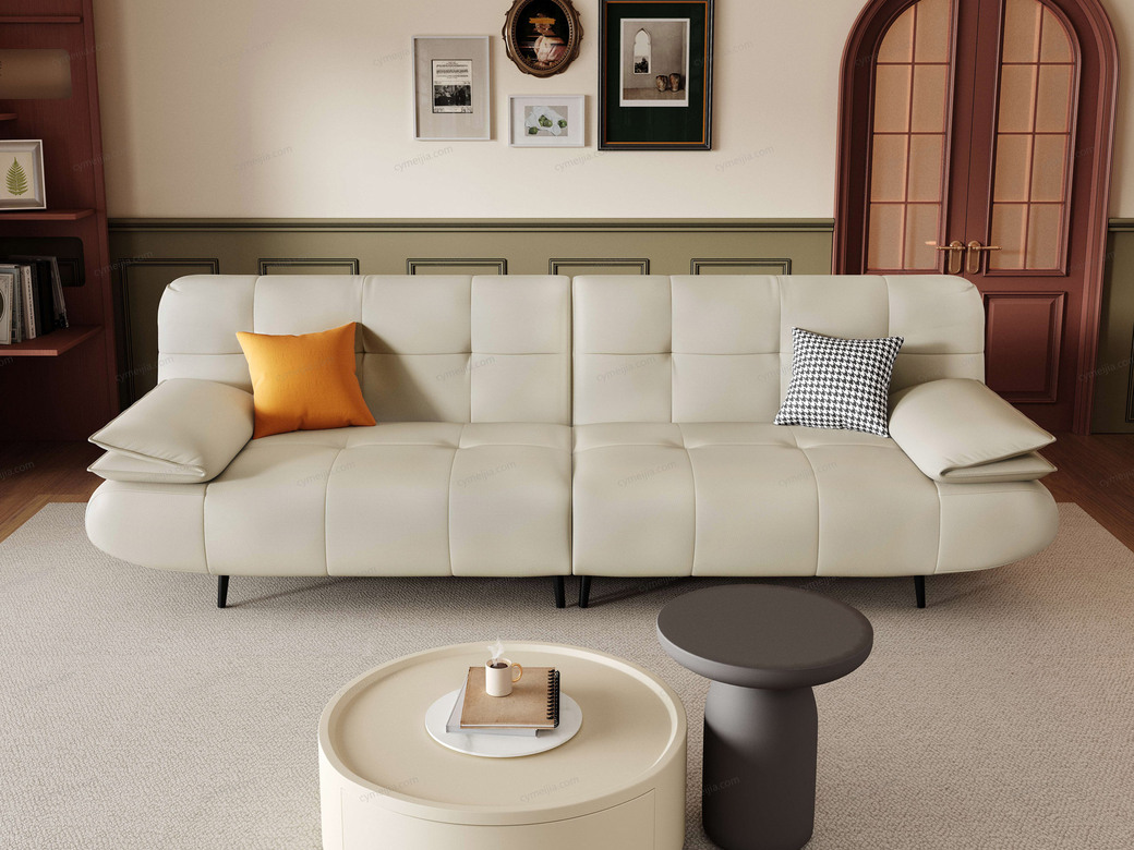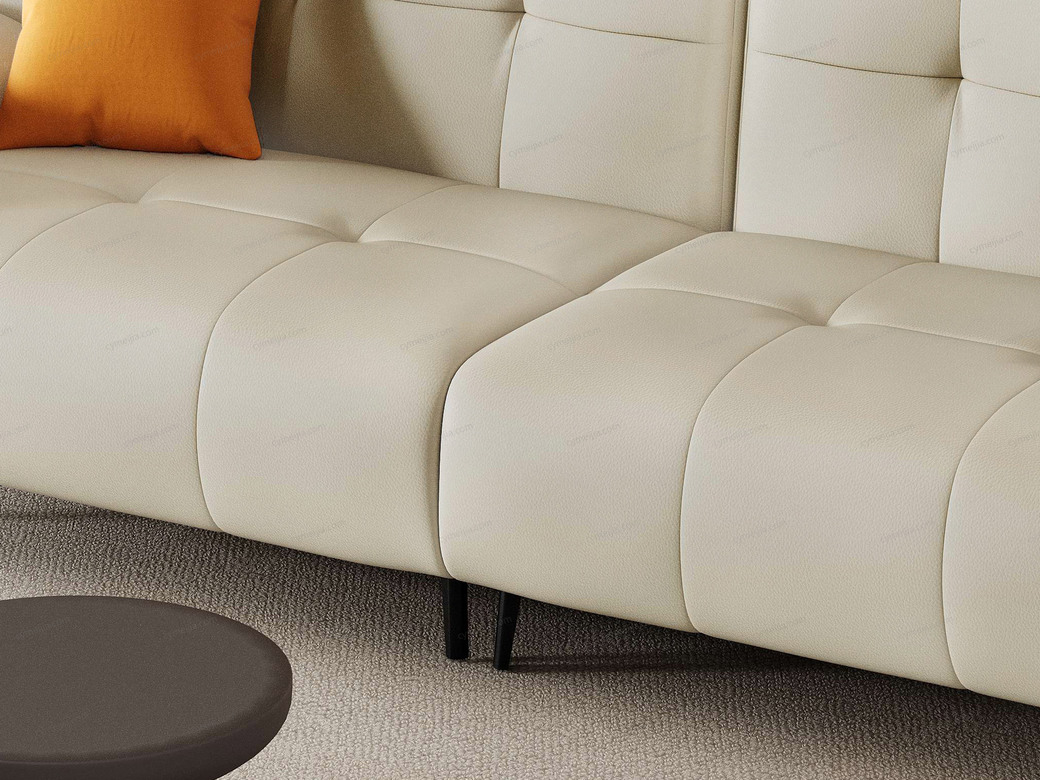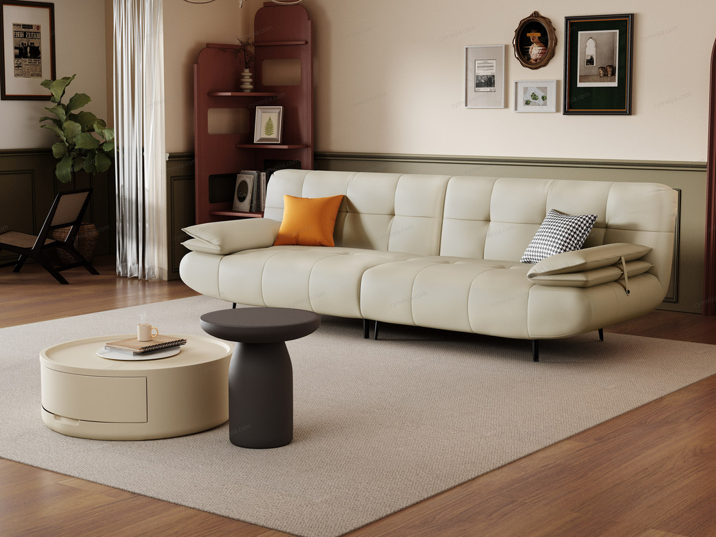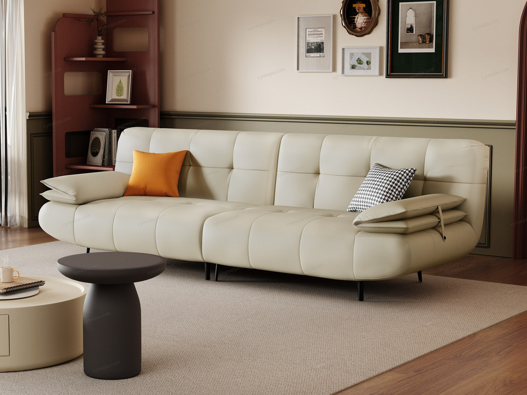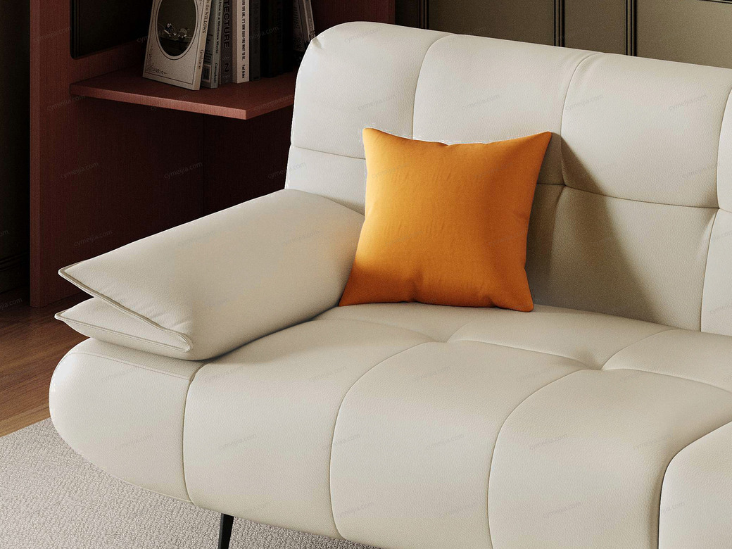 | 产品材质 : | 接触面进口头层黄牛皮+羽绒+高密度海棉+俄罗斯落叶松实木框架+蛇形弹簧+橡筋底+镀锌碳素钢脚 |
