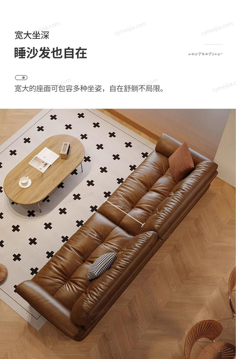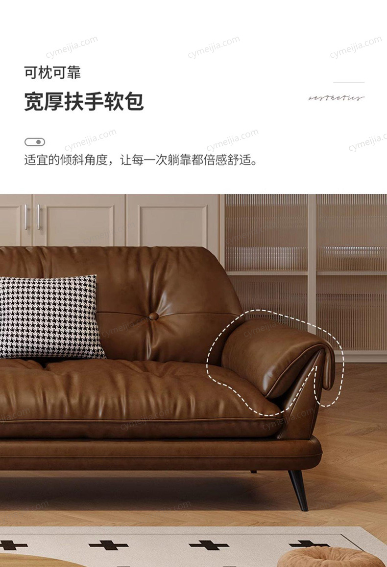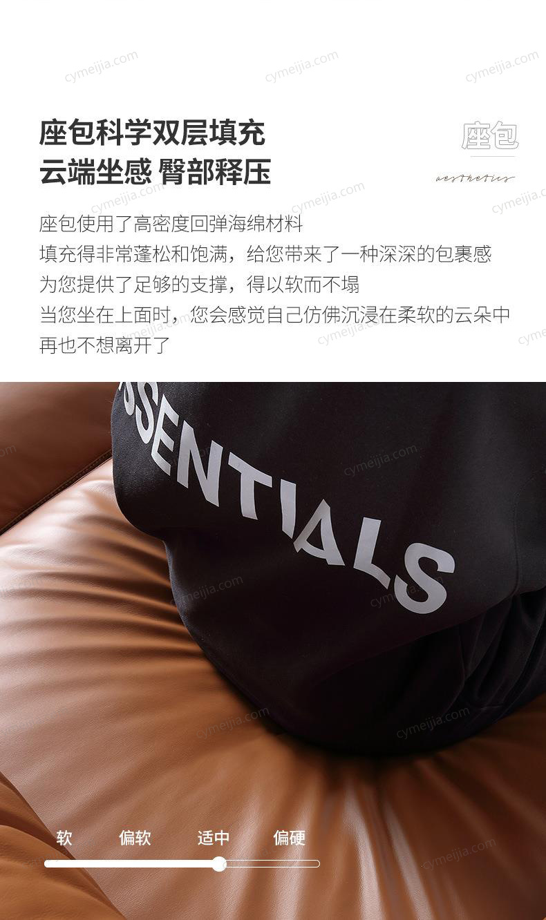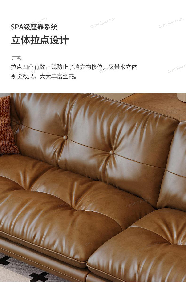 | 产品材质 : | 接触面进口头层黄牛皮+羽绒抱枕+高密无粉回弹海绵+俄罗斯落叶松实木框架+4.0金色蛇形全拱弹簧+五金脚 |