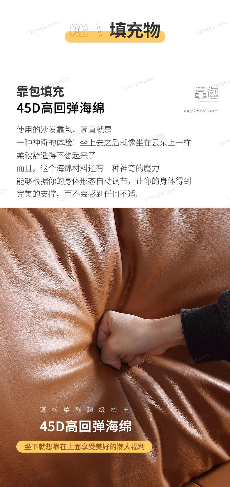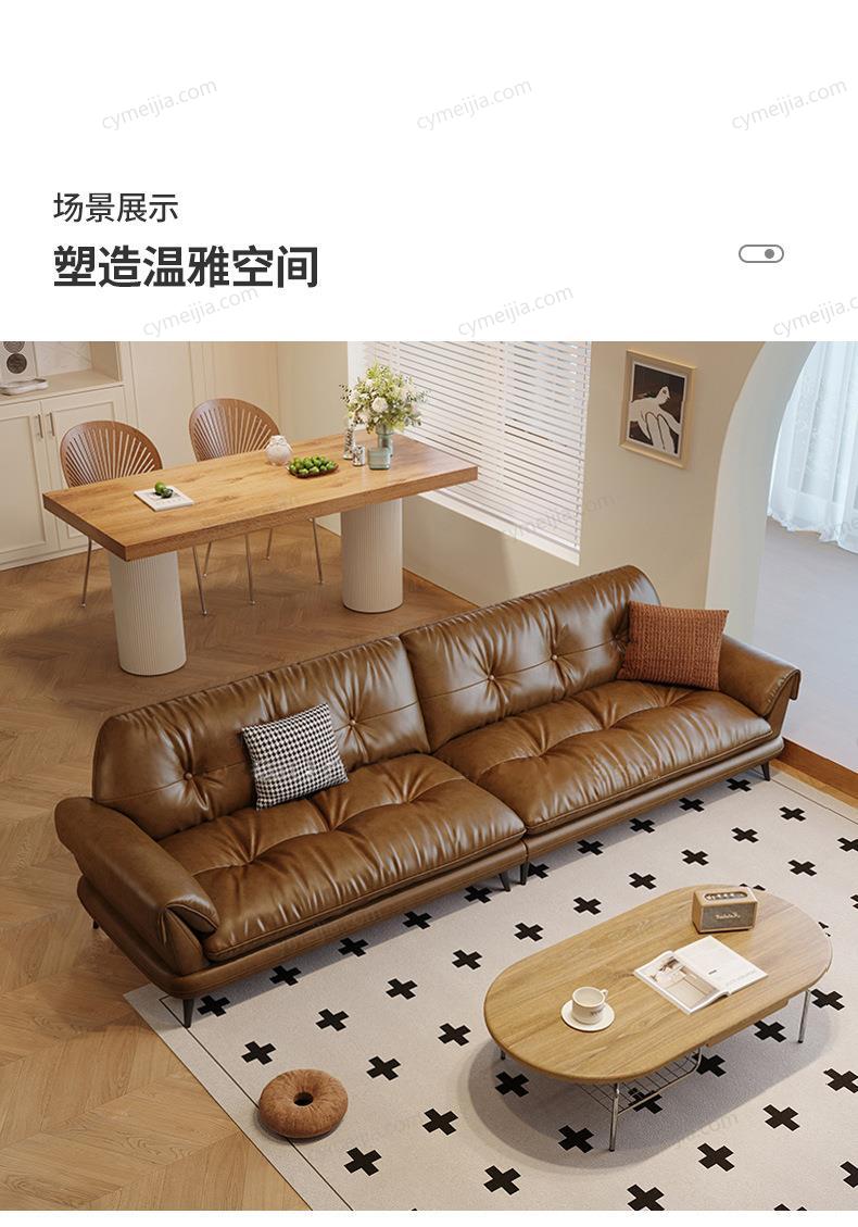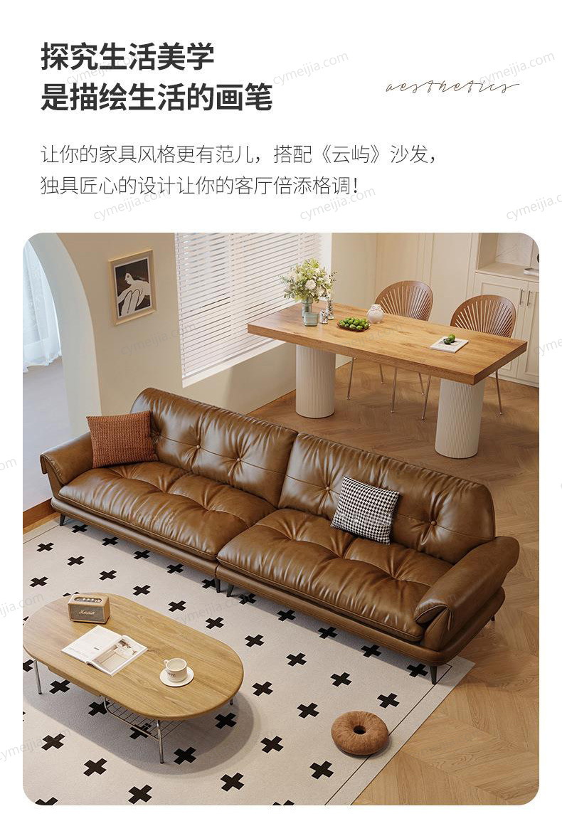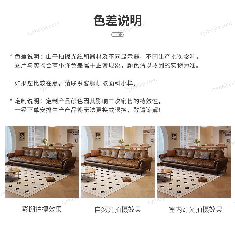 | 产品材质 : | 接触面进口头层黄牛皮+羽绒抱枕+高密无粉回弹海绵+俄罗斯落叶松实木框架+4.0金色蛇形全拱弹簧+五金脚 |