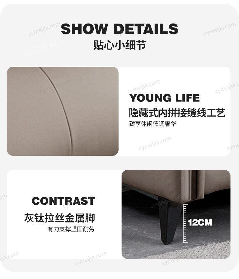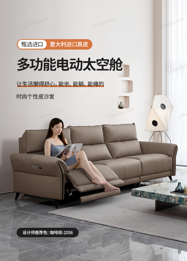 | 产品材质 : 接触面进口头层黄牛皮+羽绒靠包+45D高密度高回弹海绵+俄罗斯落叶松实木框架+蛇形弹簧+橡筋底座+功能铁架 | 包件数 : 4 | 包装体积(m3) : 2.16 | |
