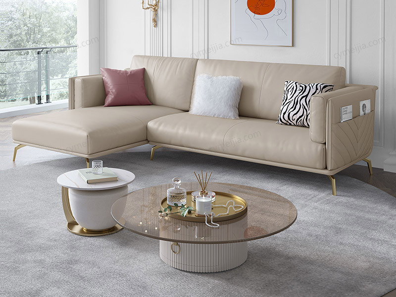 | 产品材质 : | 仿真皮+鹅绒羽绒靠包+高密度海绵+俄罗斯落叶松实木框架+不锈钢镀金脚 |