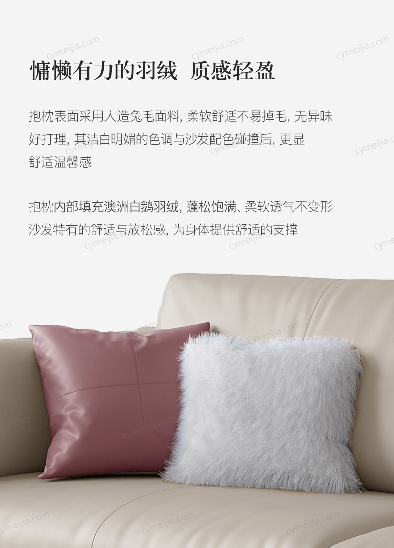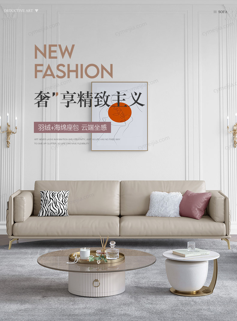 | 产品材质 : | 科技布+鹅绒羽绒靠包+高密度海绵+俄罗斯落叶松实木框架+不锈钢镀金脚 |
