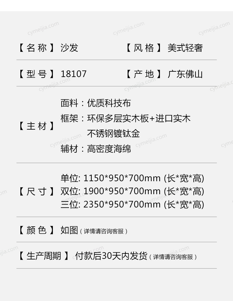 | 产品材质 : 优质科技布+高密度海绵+俄罗斯落叶松实木框架+不锈钢镀钛金+环保多层实木板 | 包装体积(m3) : 0.72 | 产地 : 佛山 | |