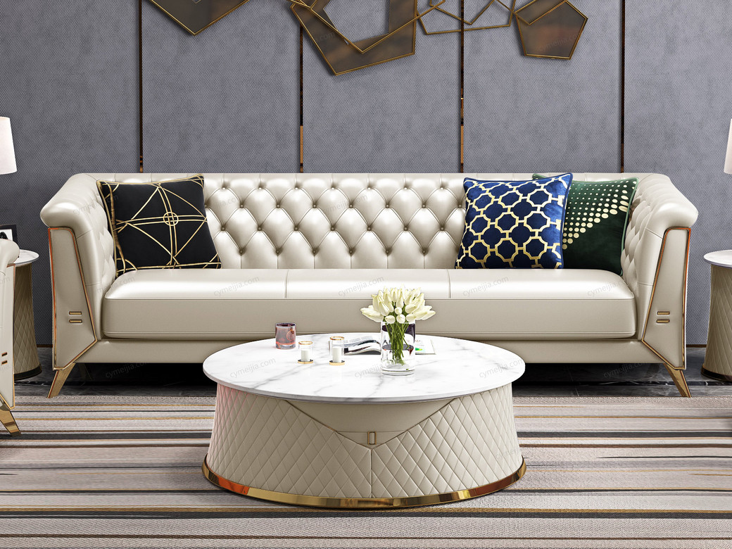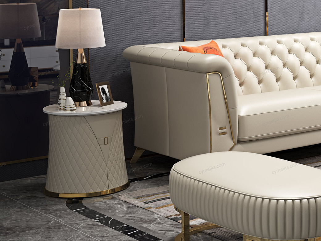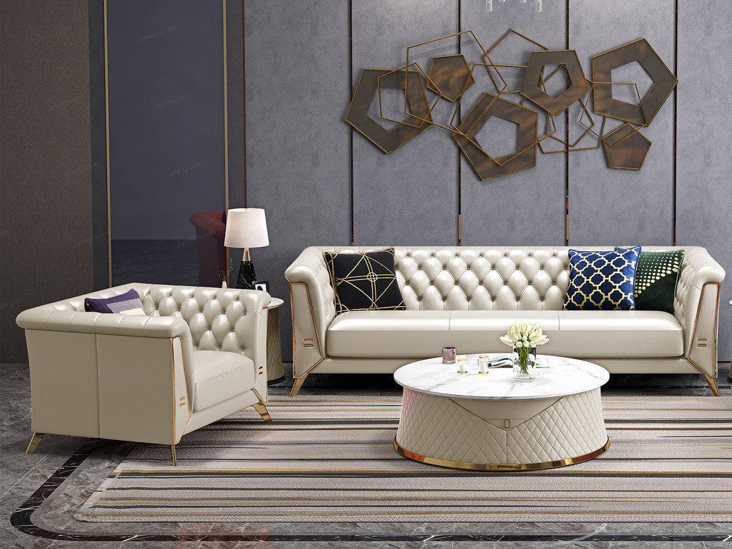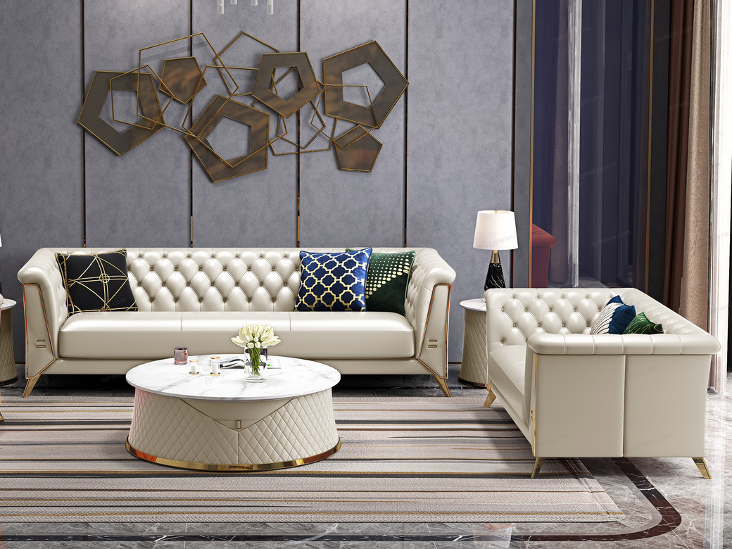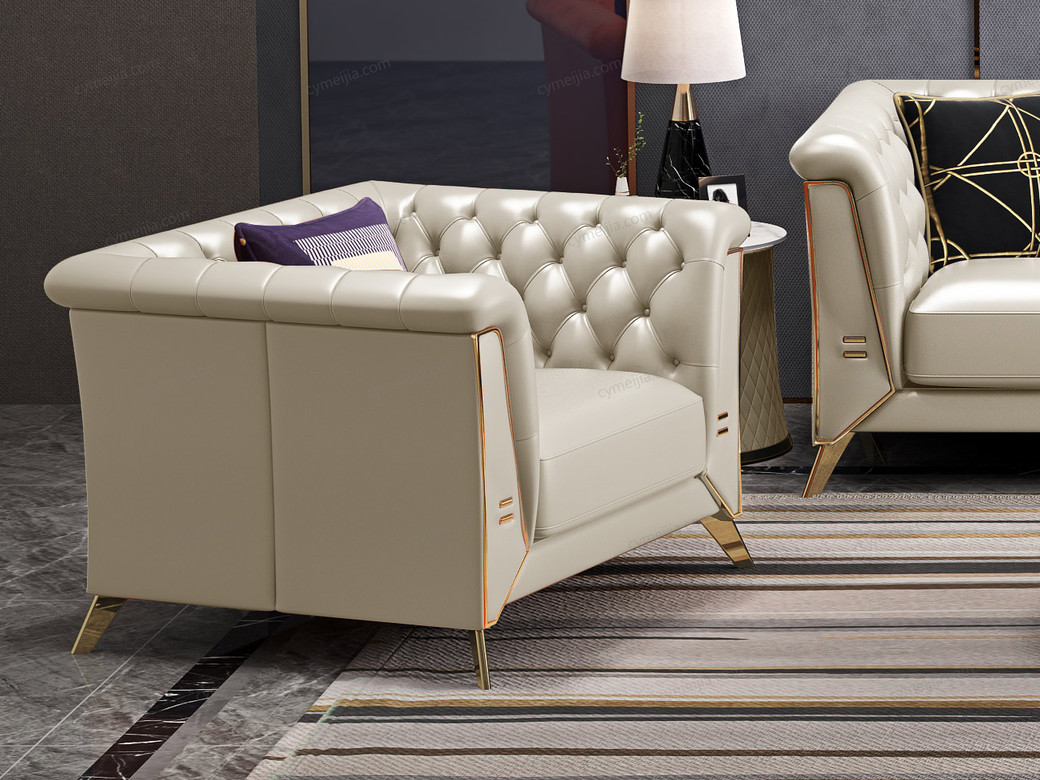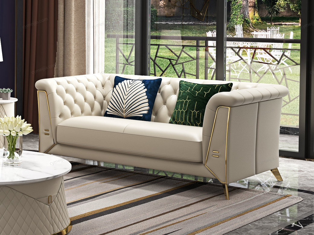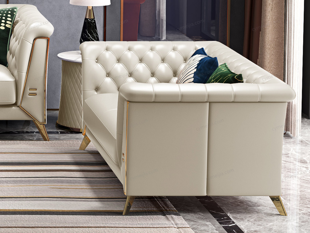 | 产品材质 : | 优质超纤皮+高密度海绵+俄罗斯落叶松实木框架+深点拉扣+不锈钢拉丝封釉镀钛金 |