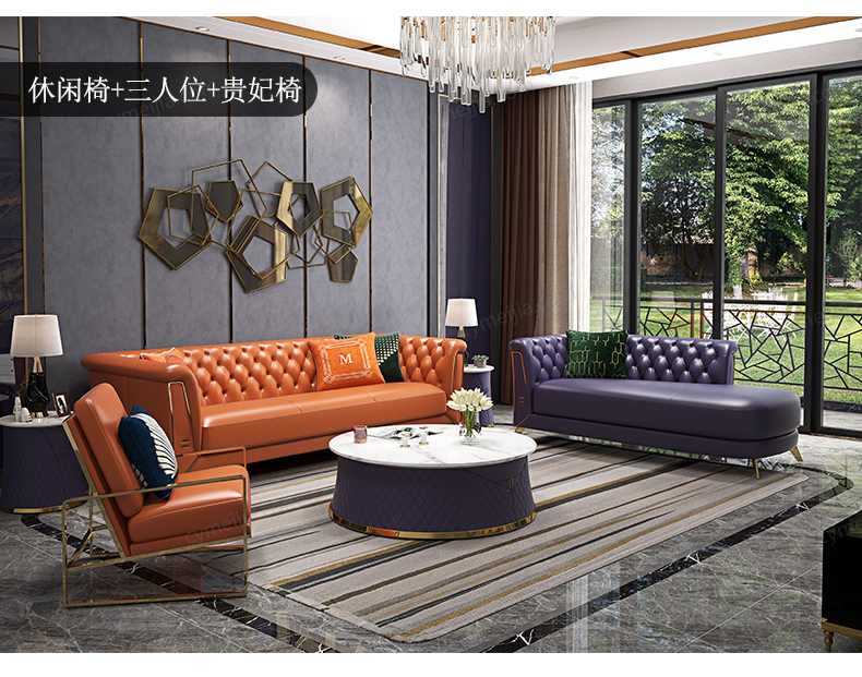| 产品材质 : | 优质超纤皮+高密度海绵+俄罗斯落叶松实木框架+深点拉扣+不锈钢拉丝封釉镀钛金 |