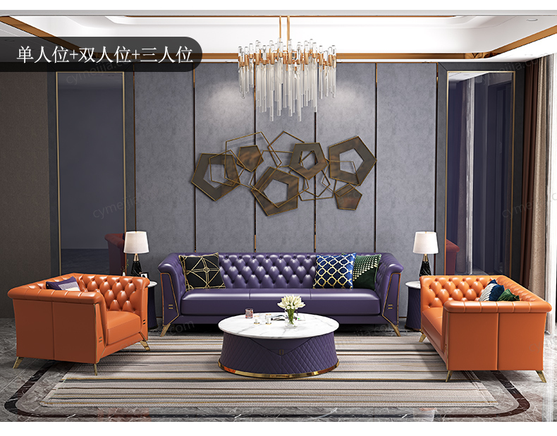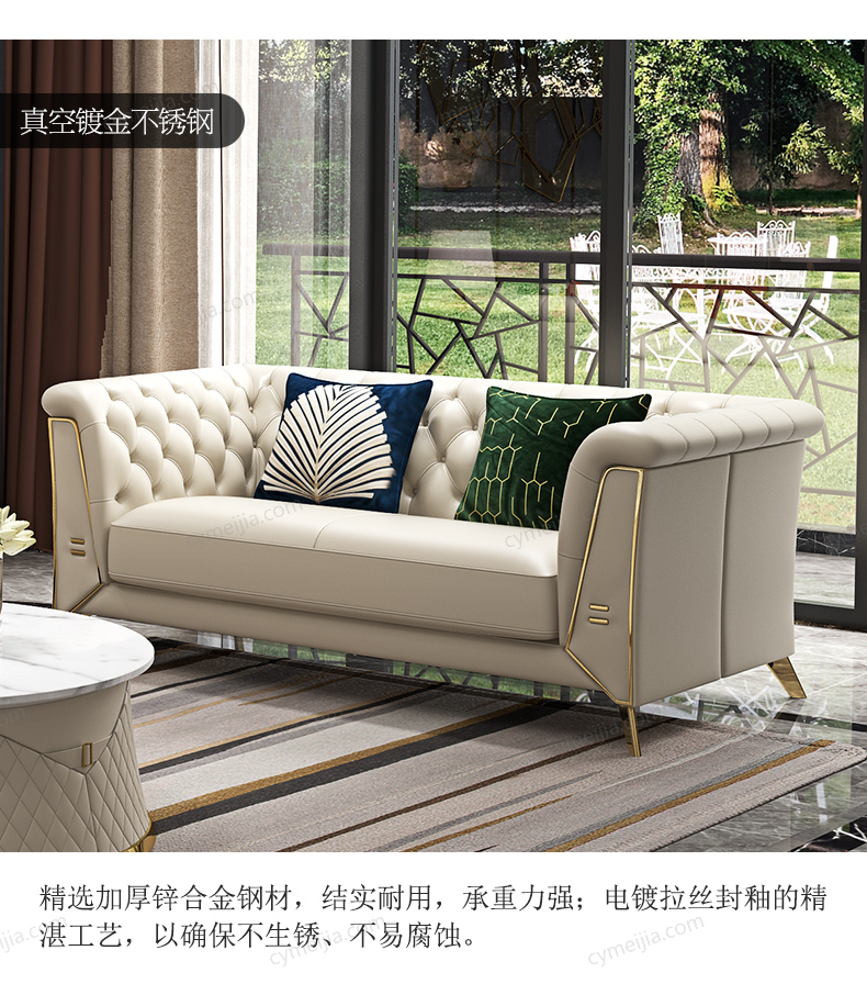 | 产品材质 : | 优质超纤皮+高密度海绵+俄罗斯落叶松实木框架+不锈钢拉丝封釉镀钛金 |