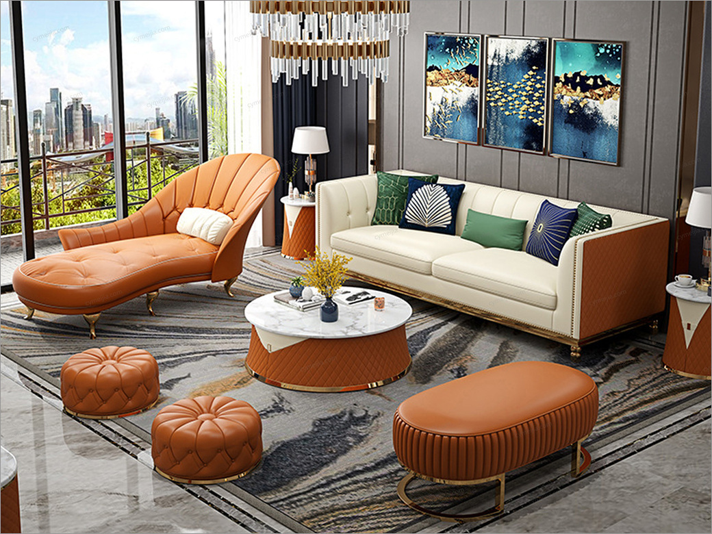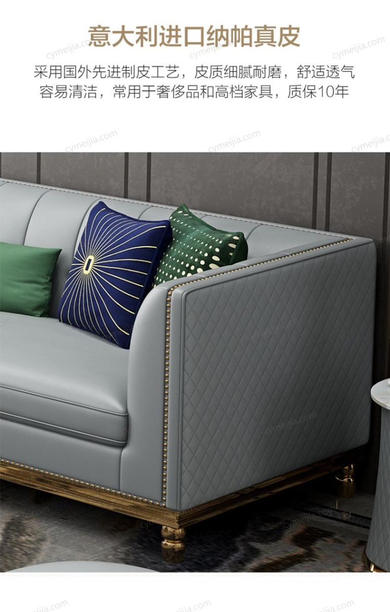 | 产品材质 : | 优质仿真皮+高密度海绵+俄罗斯落叶松实木框架+不锈钢拉丝封釉镀钛金 |