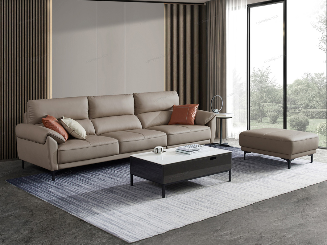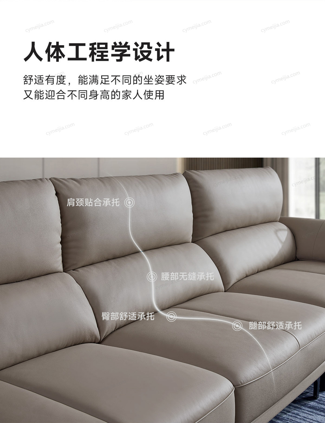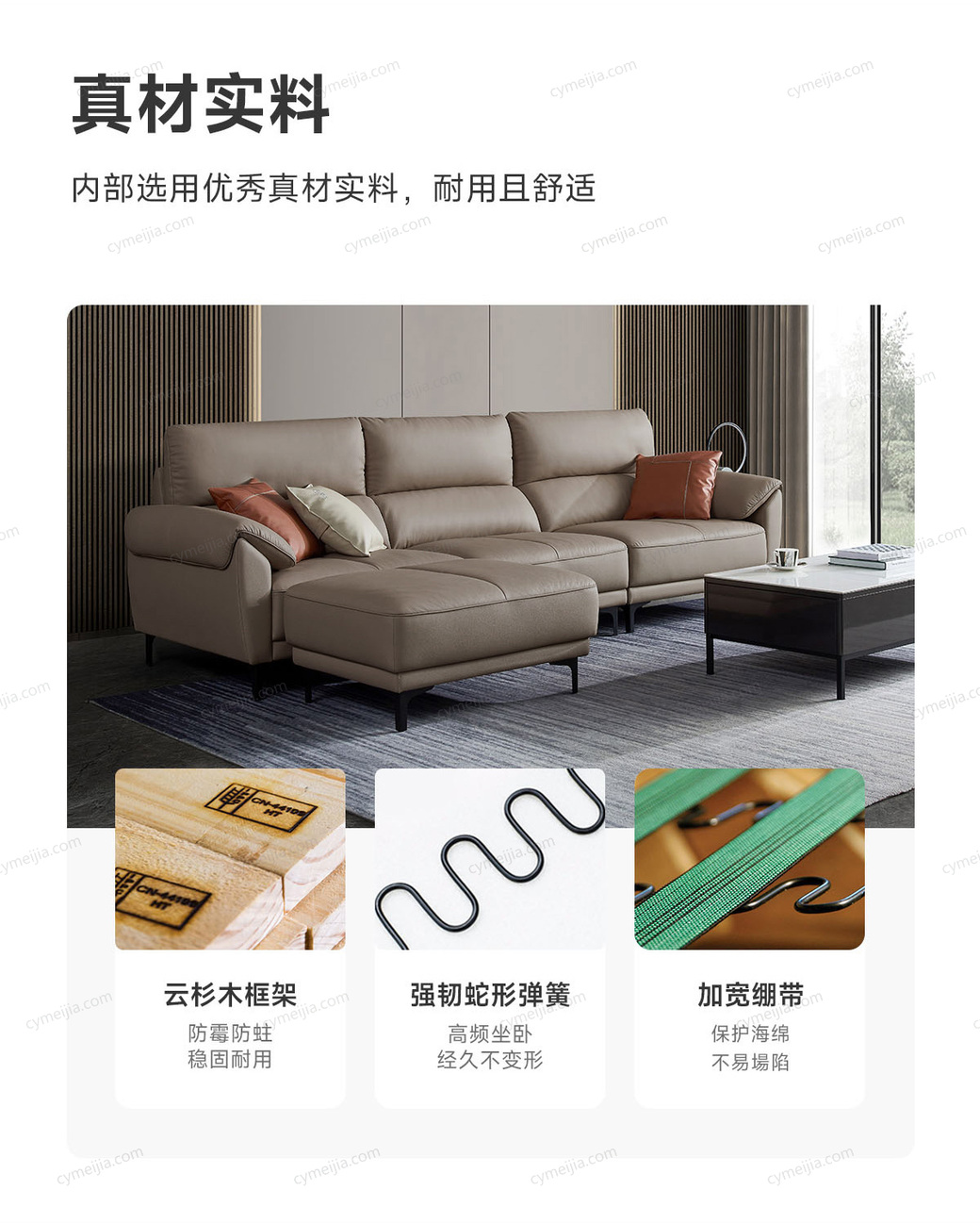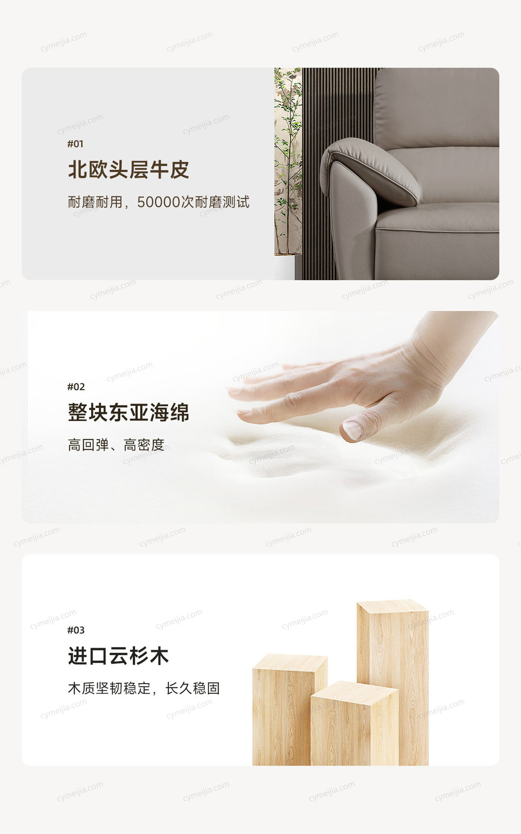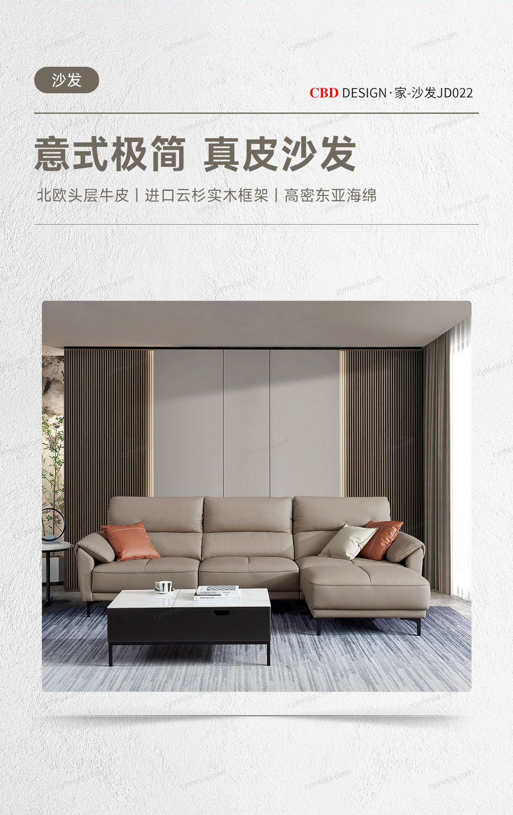 | 产品材质 : | 接触面进口头层牛皮+进口云杉木实木主框架+高回弹海绵+五金脚 |