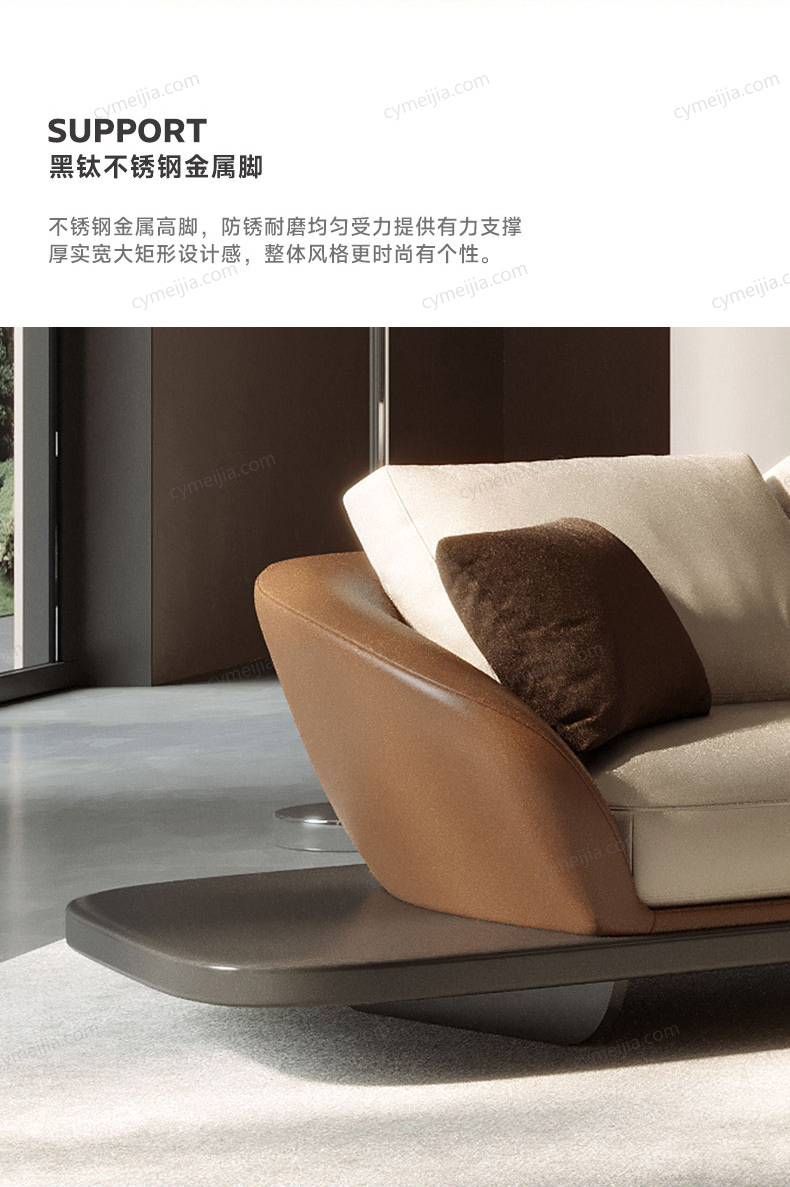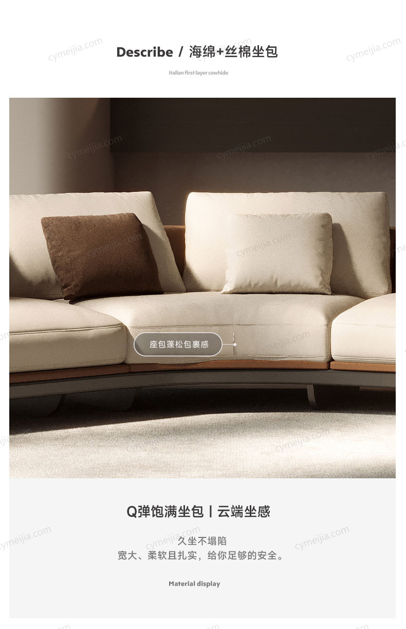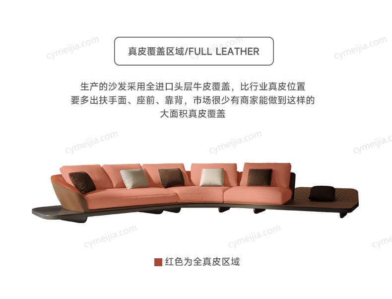 | 产品材质 : | 接触面进口头层黄牛皮+优质白鹅绒+高密度回弹海绵+俄罗斯落叶松实木框架+不锈钢脚 |