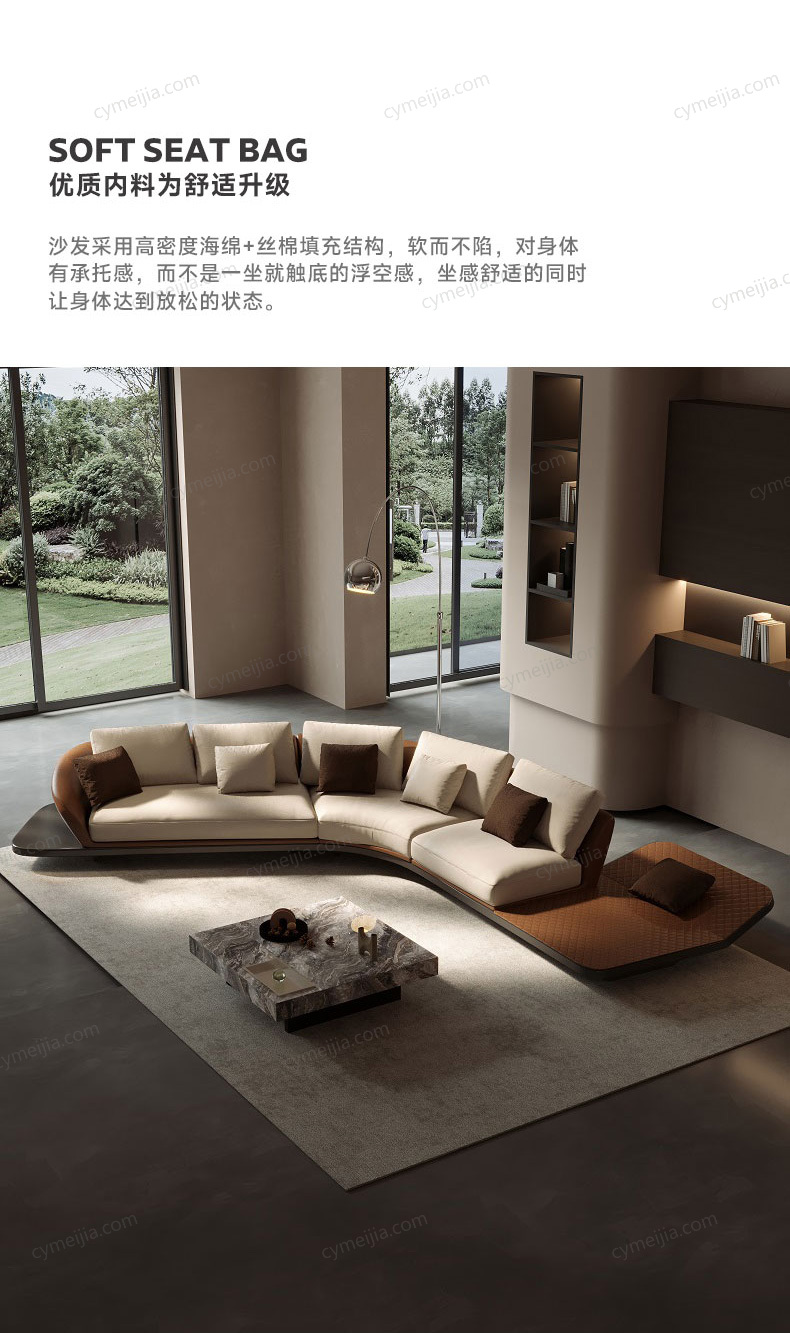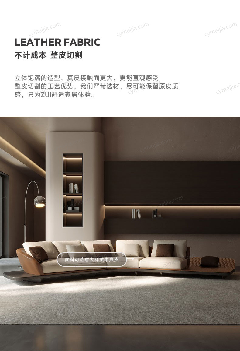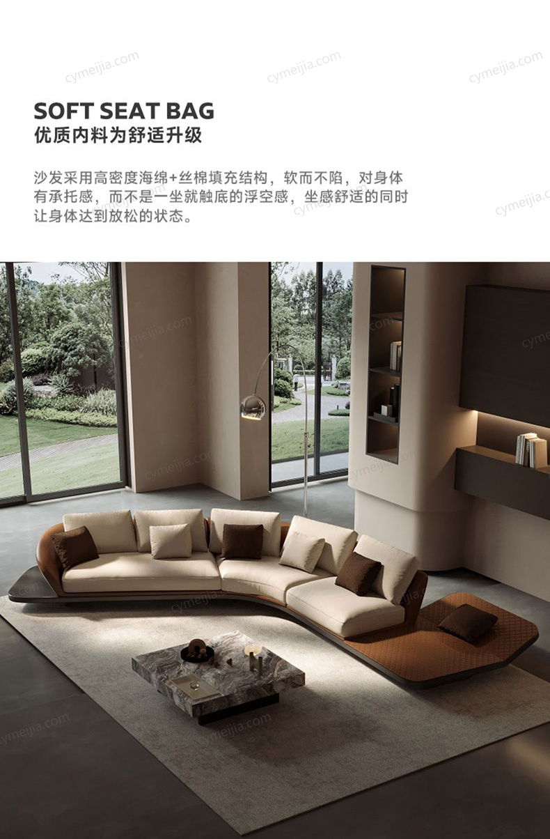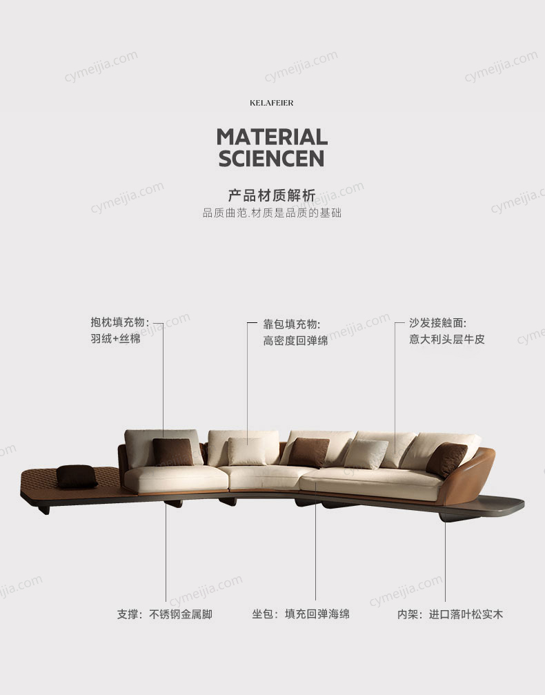 | 产品材质 : 接触面进口头层黄牛皮+优质白鹅绒+高密度回弹海绵+俄罗斯落叶松实木框架+不锈钢脚 | 包件数 : 3 | 包装体积(m3) : 4.18 | |