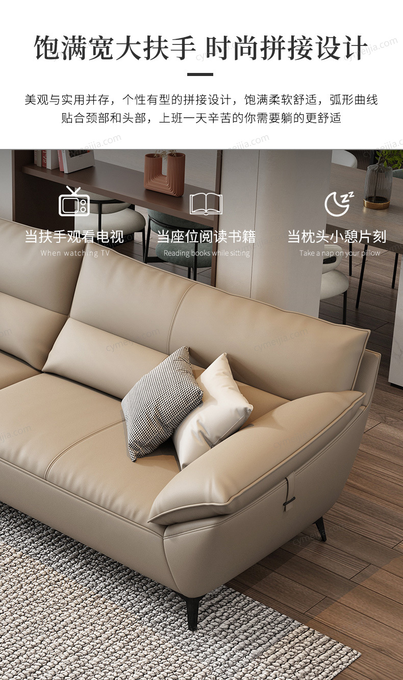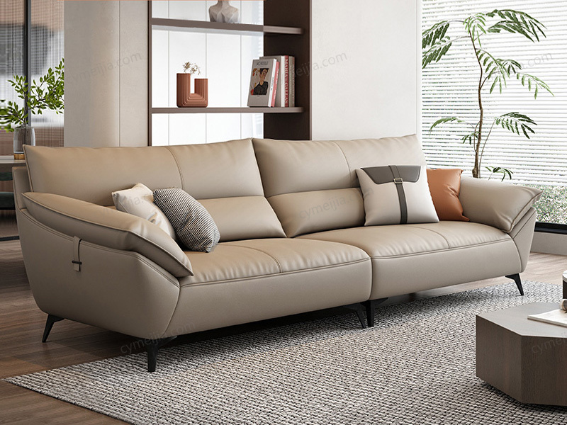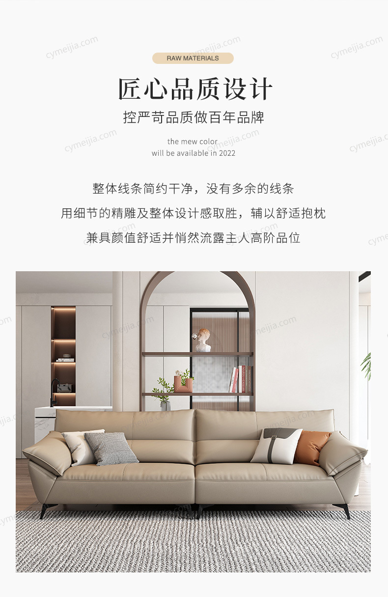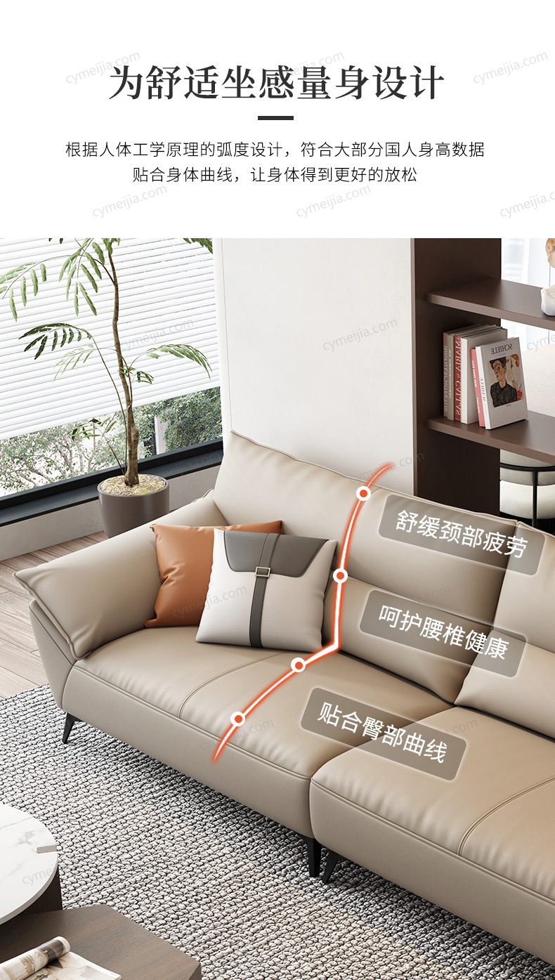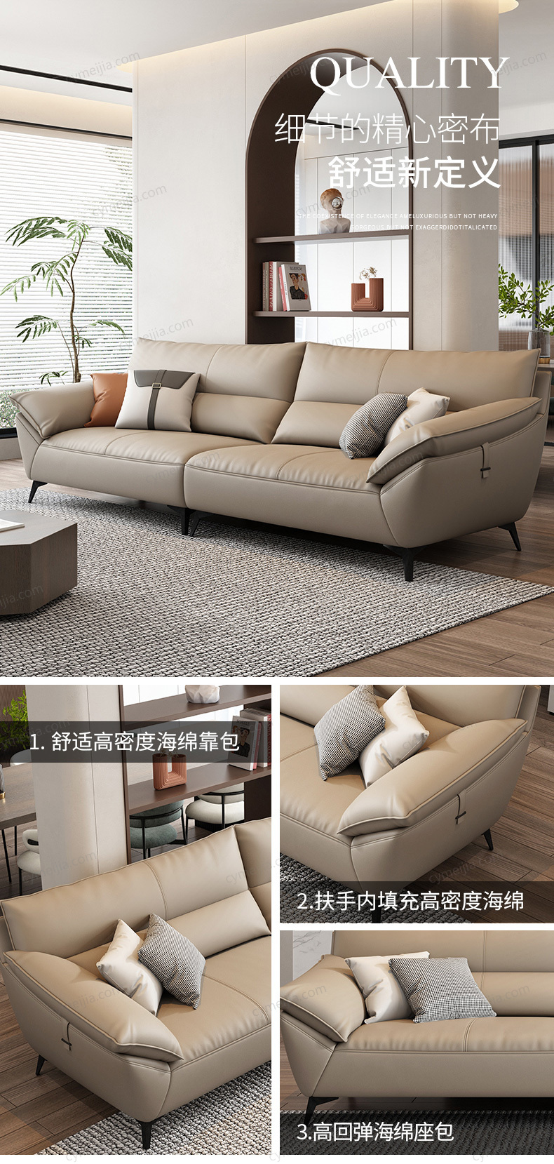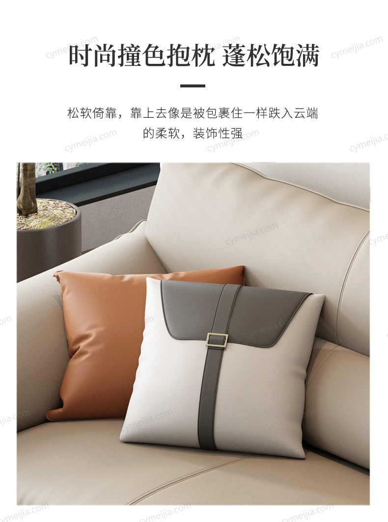 | 产品材质 : | 接触面进口头层黄牛皮+羽绒抱枕+高密度海绵+俄罗斯落叶松实木框架+10公分五金脚 |