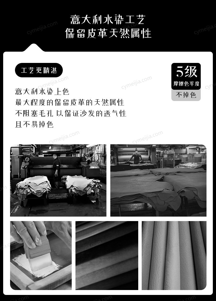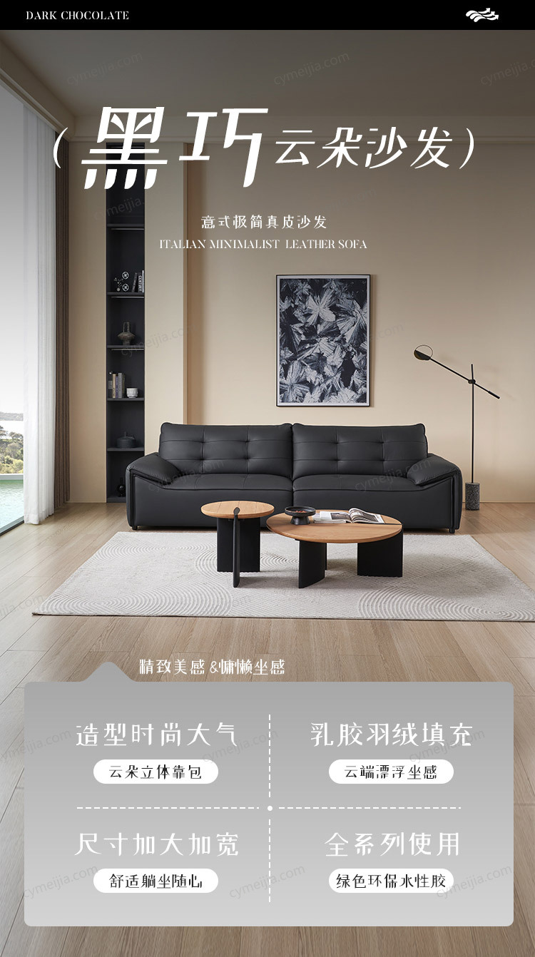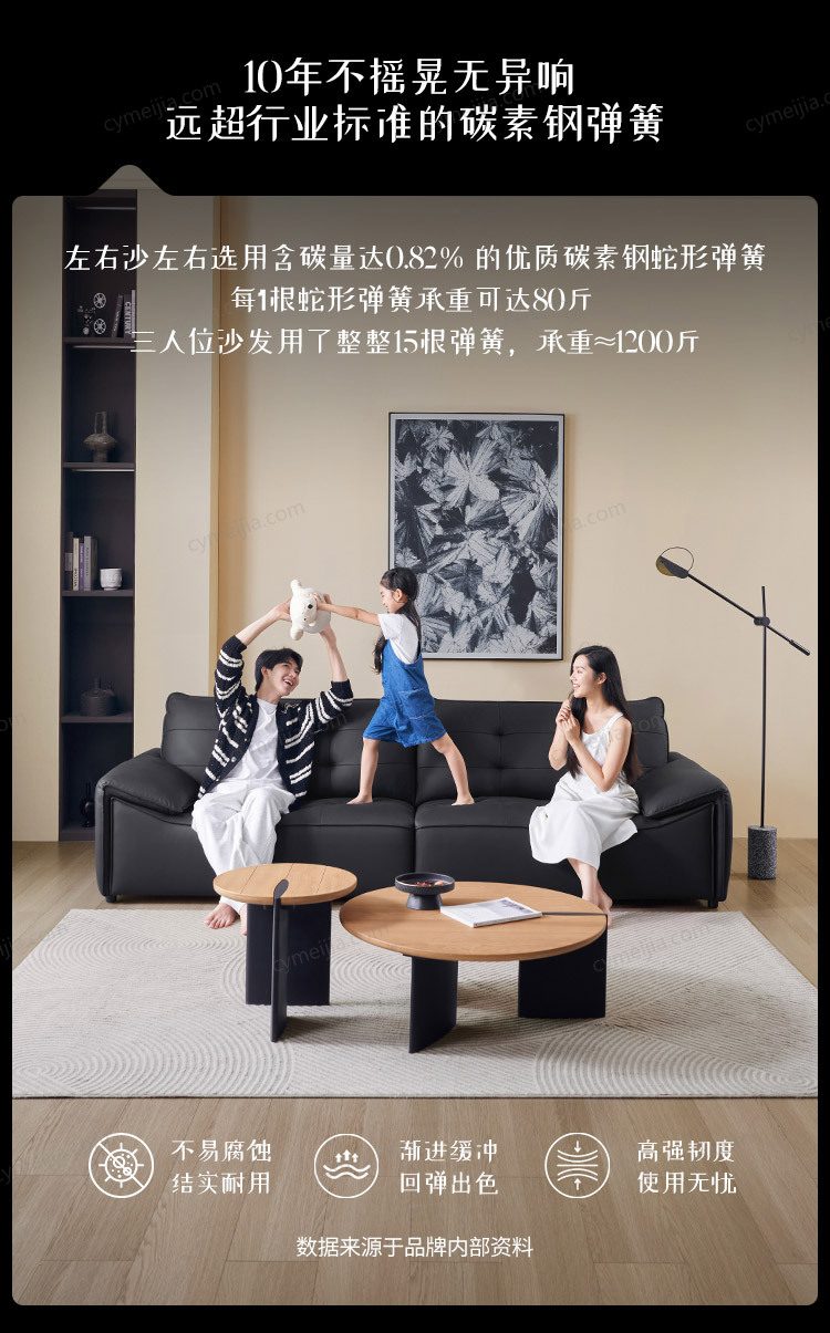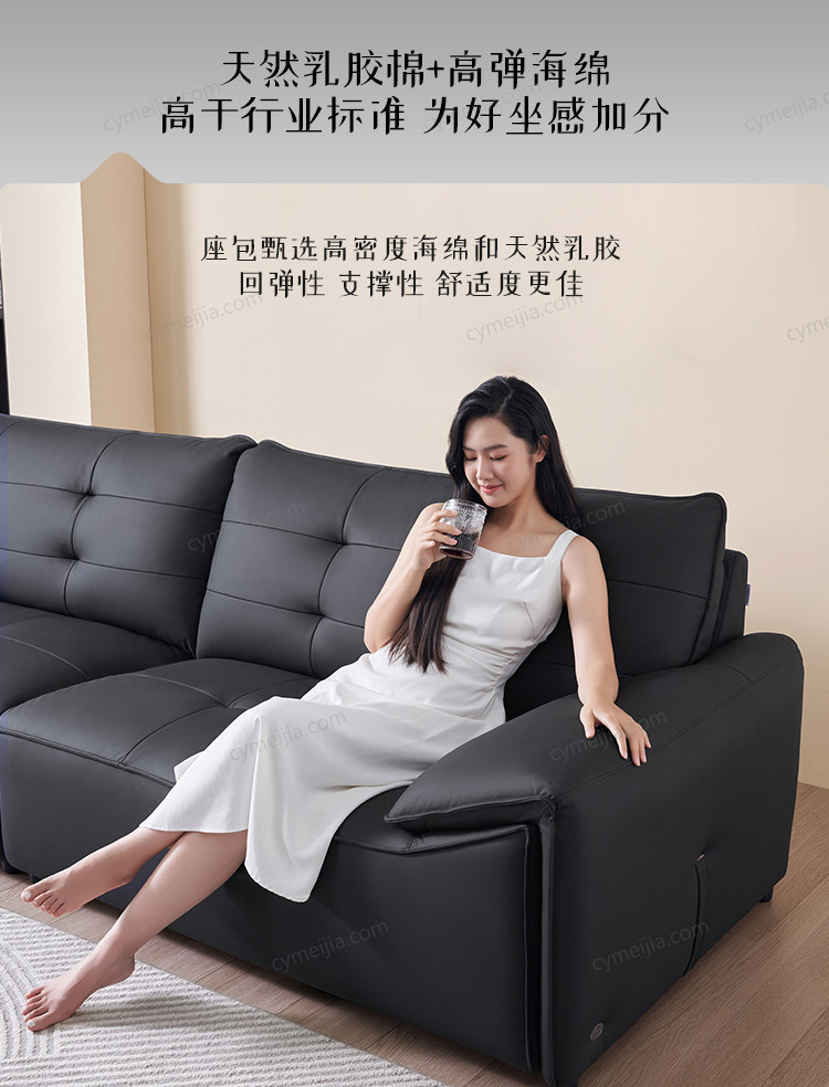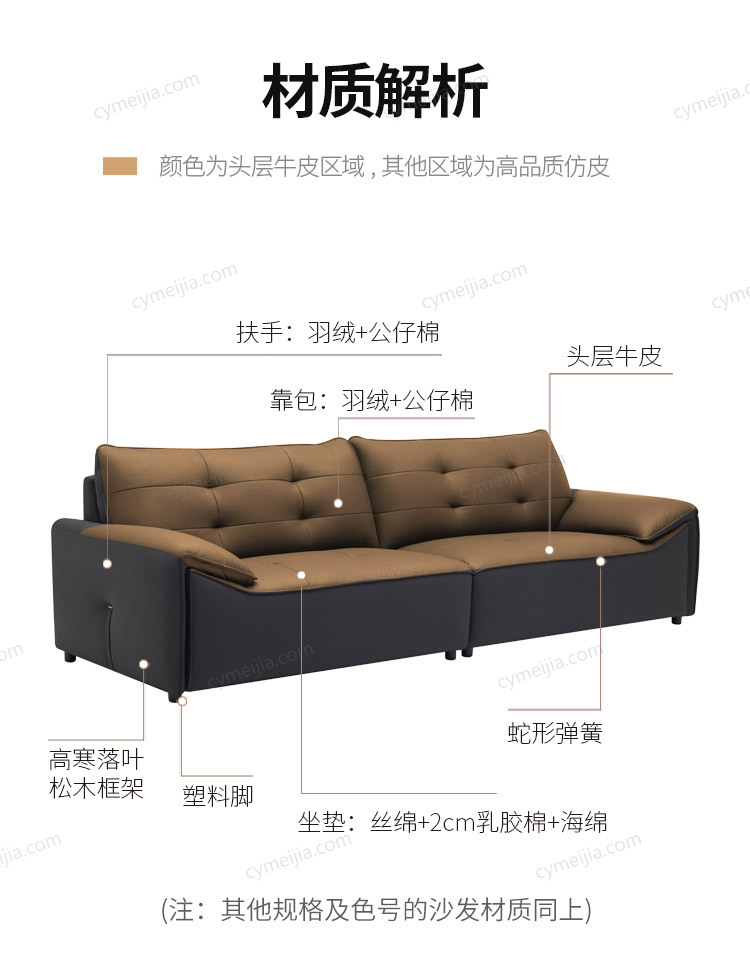 | 产品材质 : | 接触面进口头层牛皮+天然乳胶棉+羽绒+碳素钢蛇形弹簧+高弹海绵+俄罗斯落叶松实木框架 |