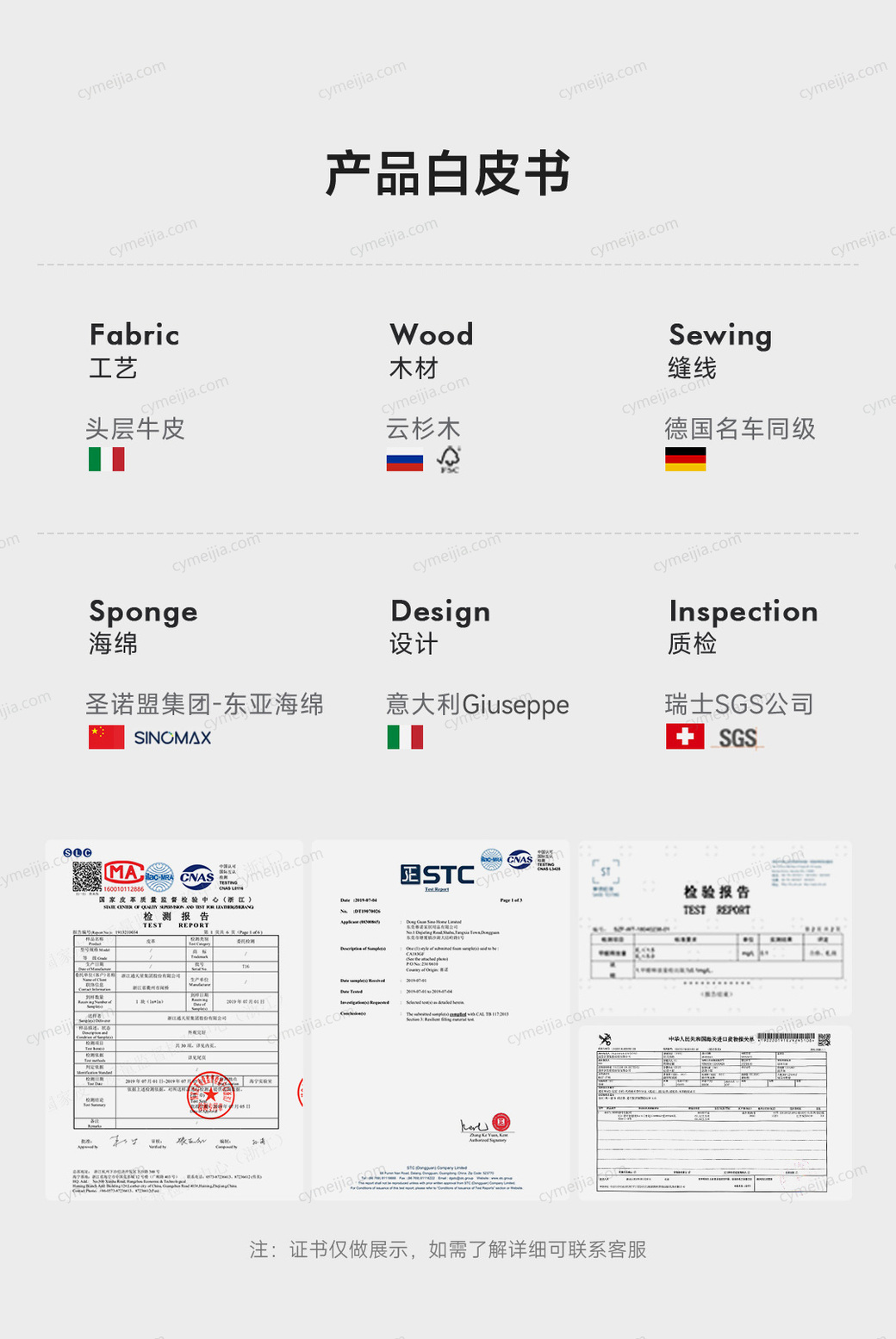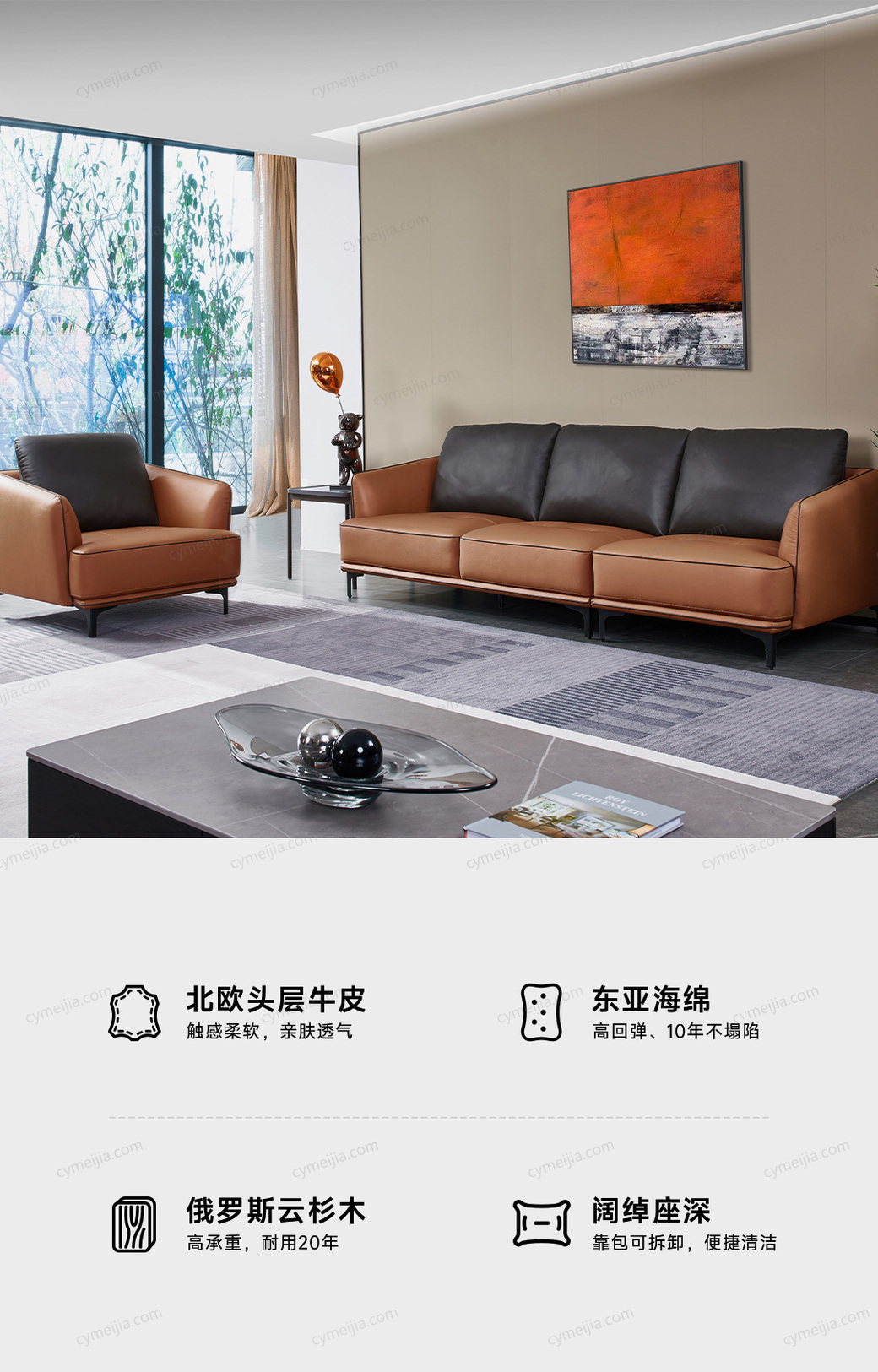 | 产品材质 : 接触面进口头层黄牛皮+非接触面仿进口头层黄牛皮+俄罗斯云杉木+东亚海绵 | 包件数 : 2 | 包装体积(m3) : 1.92 | |