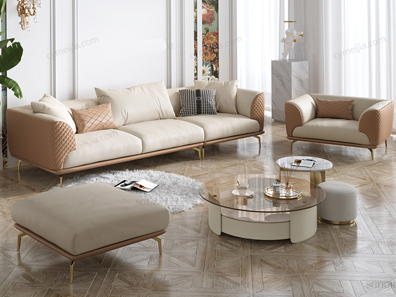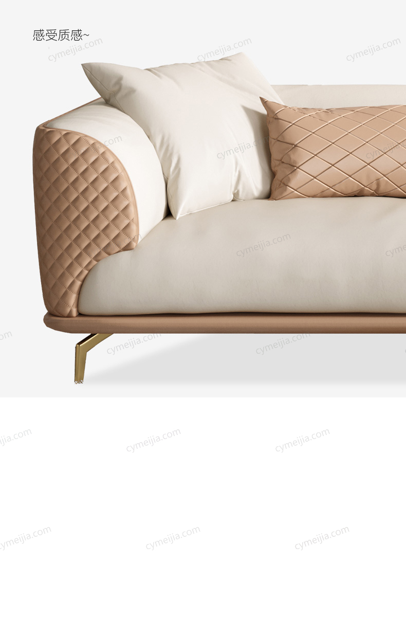 | 产品材质 : | 仿真皮+羽绒靠包/扶手+高密度海绵+俄罗斯落叶松实木框架+不锈钢镀金脚 |