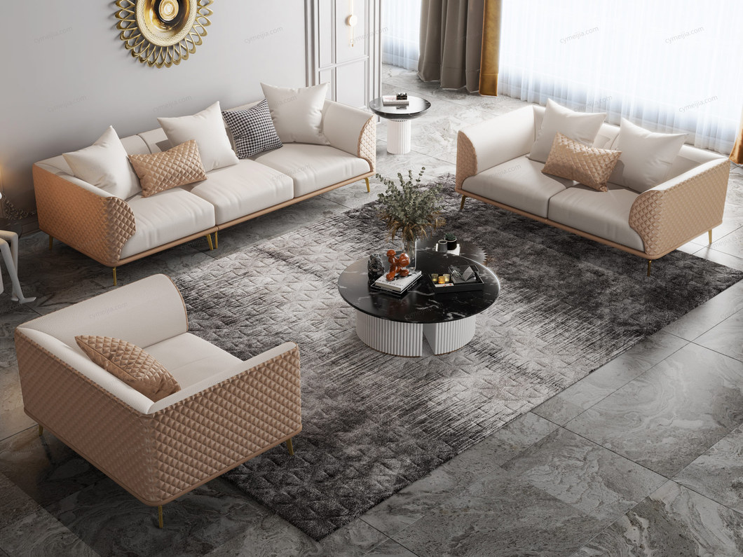 | 产品材质 : 接触面进口头层黄牛皮+羽绒靠包/扶手+高密度海绵+俄罗斯落叶松实木框架+不锈钢镀金脚 | 包件数 : 3 | 包装体积(m3) : 2.58 | |