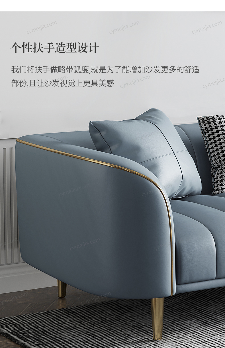 | 产品材质 : 接触面进口头层黄牛皮+羽绒+高密度海绵+俄罗斯落叶松实木框架+不锈钢镀金脚 | 包件数 : 3 | 包装体积(m3) : 2.76 | |