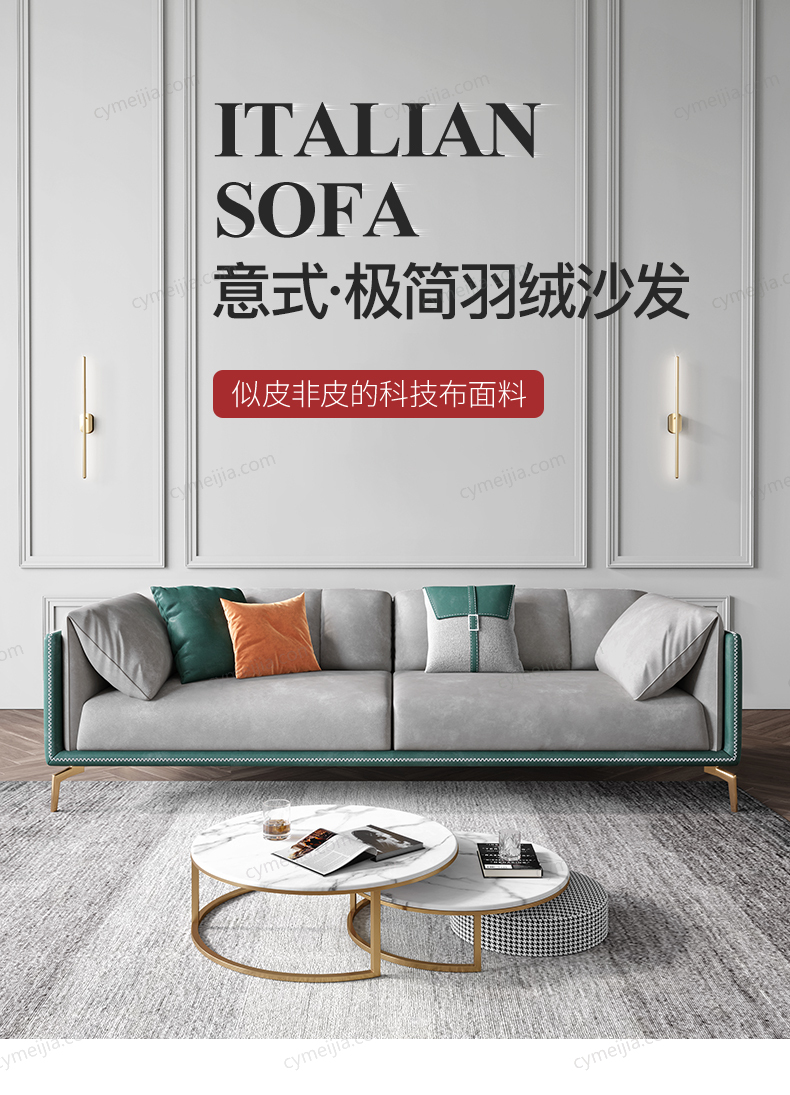 | 产品材质 : | 科技布+羽绒靠包/扶手+高密度海绵+俄罗斯落叶松全实木框架+不锈钢镀金脚 |