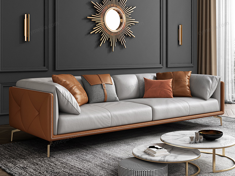 | 产品材质 : | 仿真皮+羽绒靠包/扶手+高密度海绵+俄罗斯落叶松全实木框架+不锈钢镀金脚 |