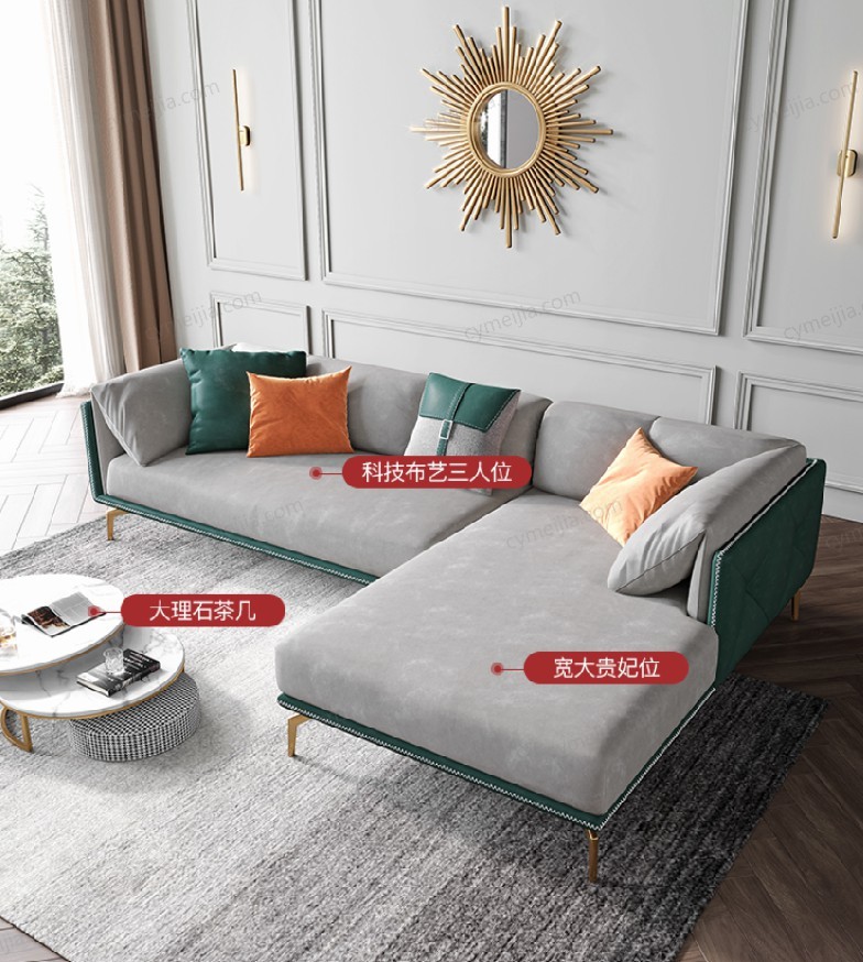 | 产品材质 : | 科技布+羽绒靠包/扶手+高密度海绵+俄罗斯落叶松全实木框架+不锈钢镀金脚 |