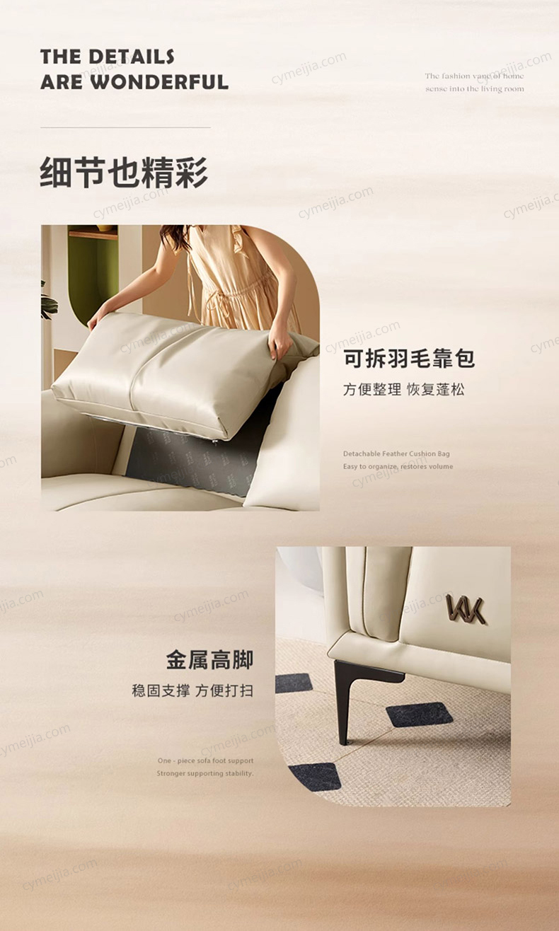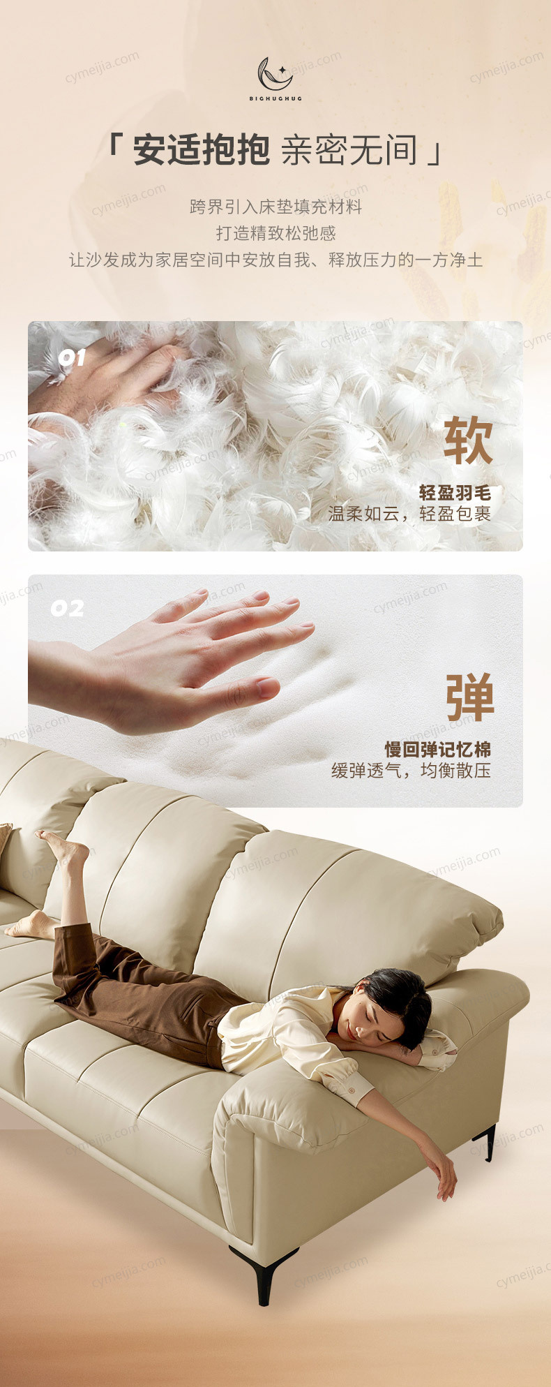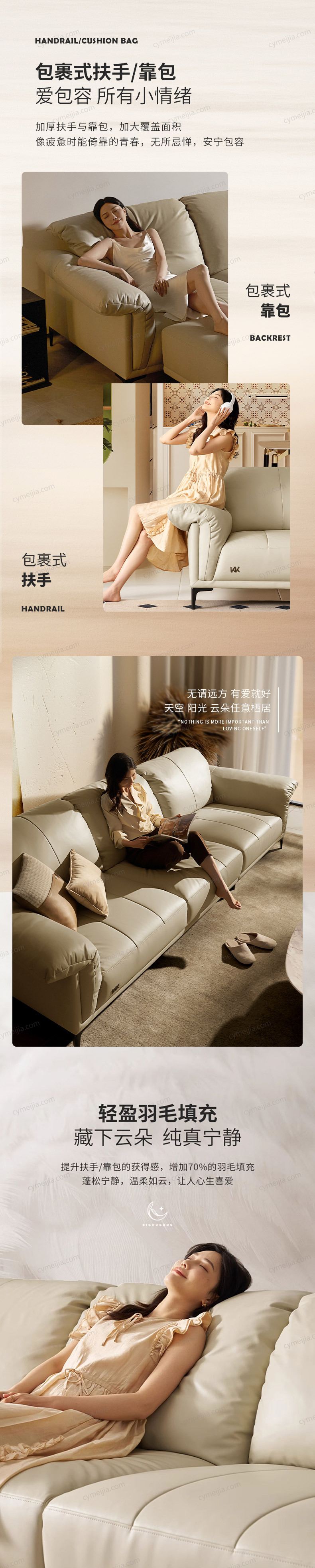 | 产品材质 : | 接触面进口头层黄牛皮+羽毛+高密度海绵+实木框架+金属脚 |