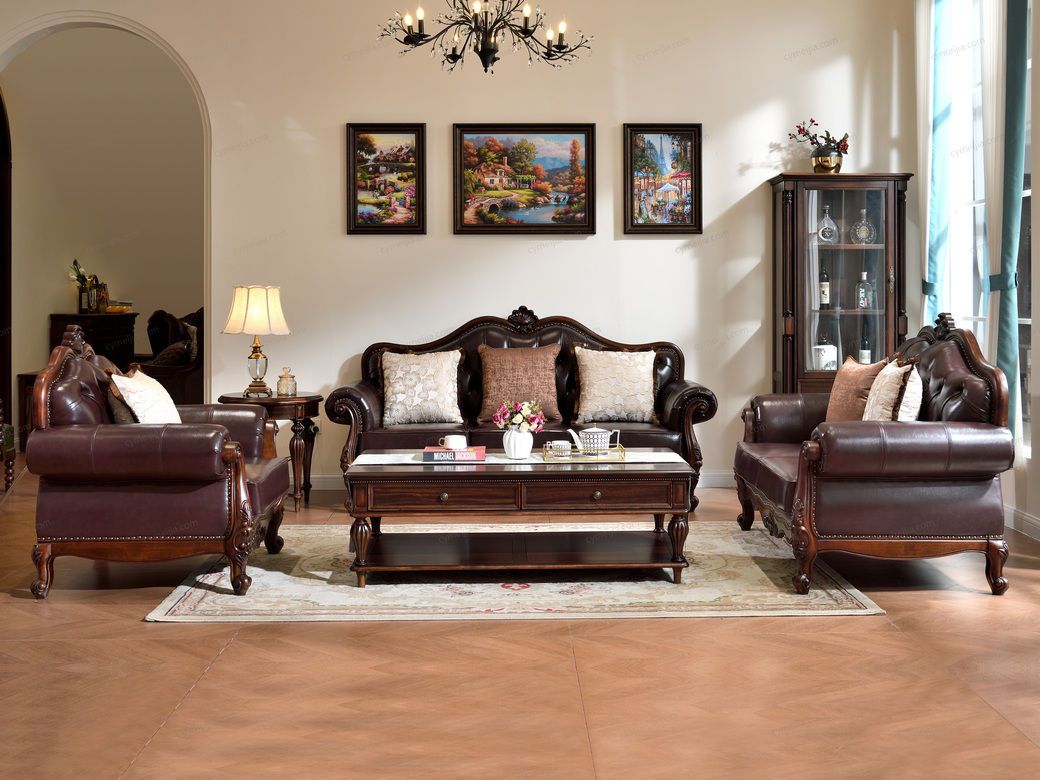 | 产品材质 : 仿真皮+黑胡桃木+高密度海绵+俄罗斯落叶松实木框架 | 包件数 : 3 | 包装体积(m3) : 7.8 | |