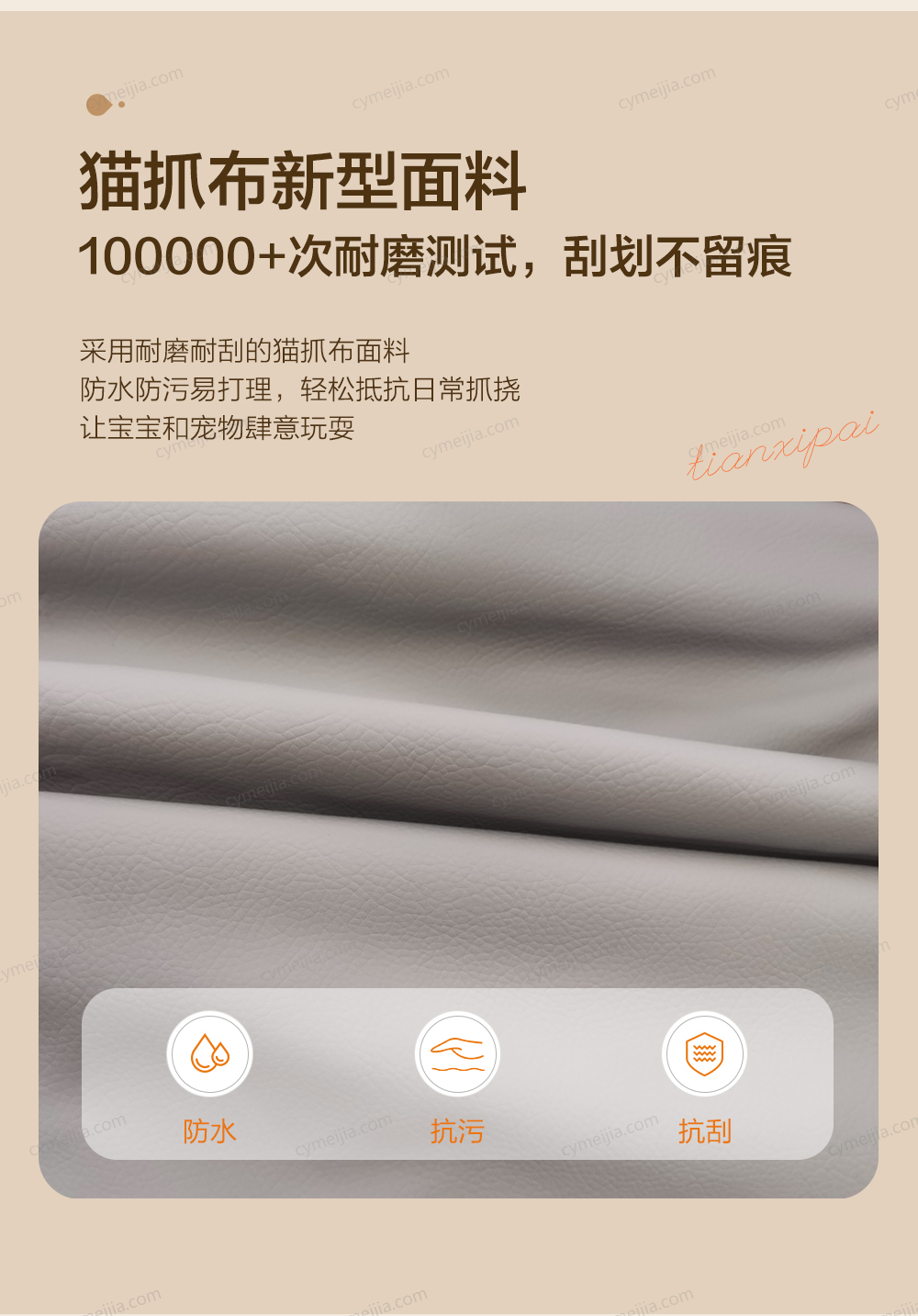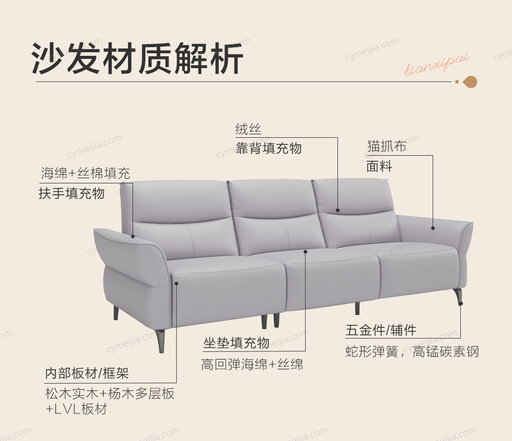 | 产品材质 : | 猫抓皮+仿皮+绒丝+实木多层板+杨木多层板+多层高回弹海绵+弹力棉+进口俄罗斯落叶松实木框架 |