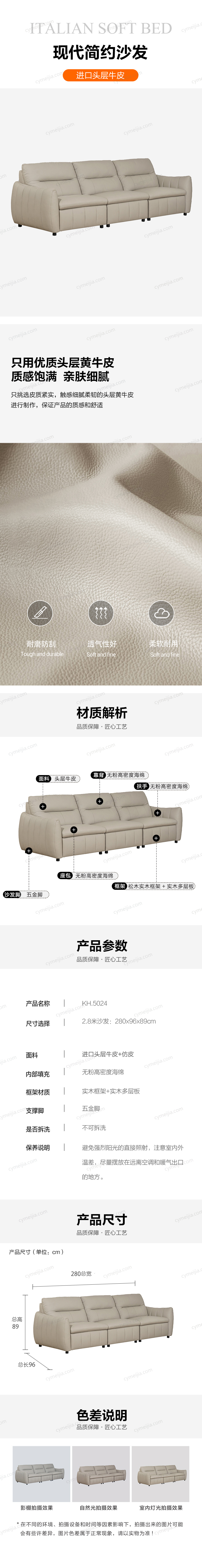 | 产品材质 : | 接触面头层牛皮+无粉高密度海绵+进口俄罗斯落叶松实木框架+E1级环保板 |