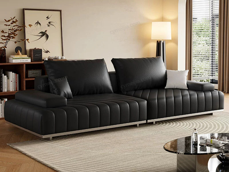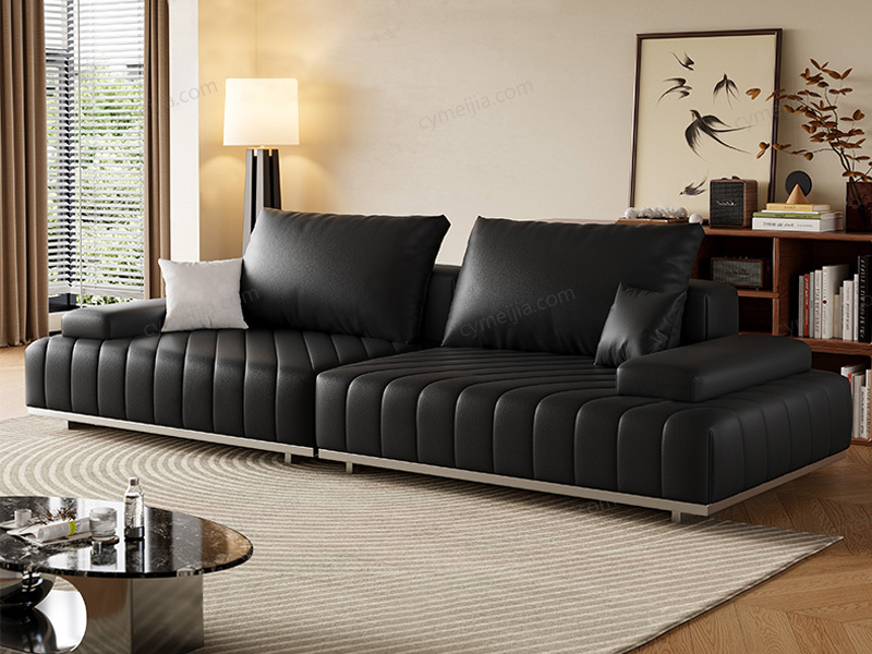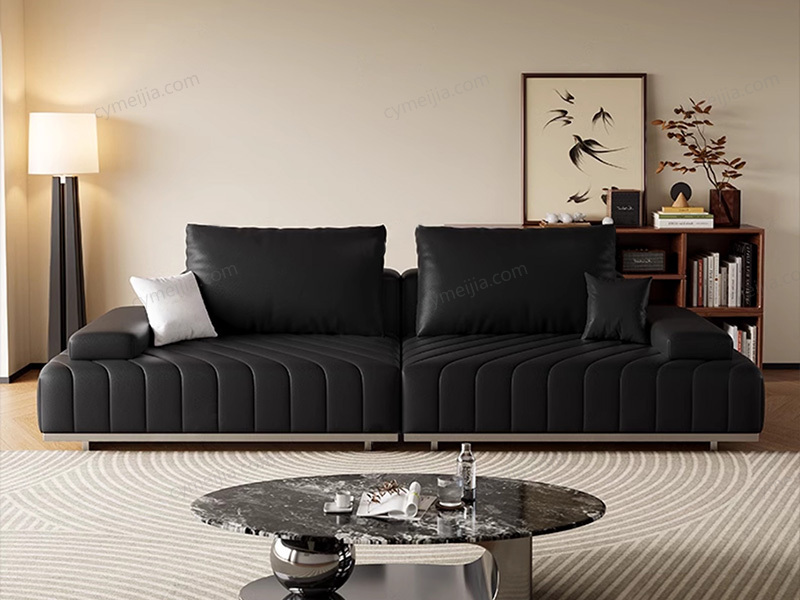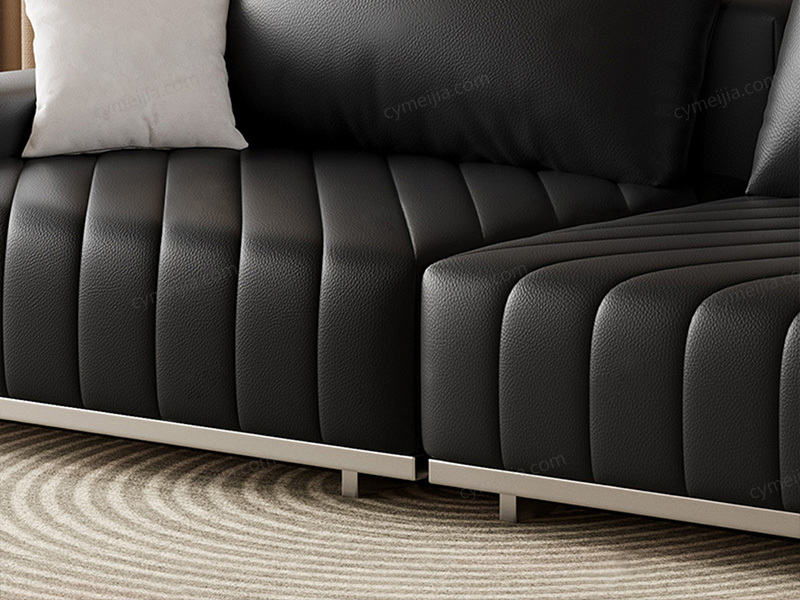 | 产品材质 : | 接触面进口头层黄牛皮+羽绒靠包+高密度海绵+俄罗斯落叶松实木框架+拉丝不锈钢脚 |