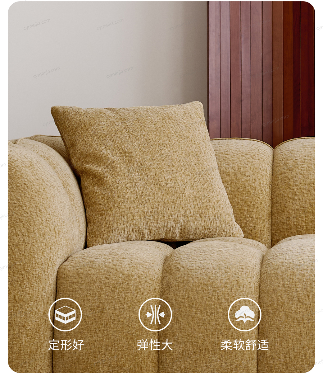 | 产品材质 : | 雪尼尔绒布+羽绒抱枕+紫罗兰海绵+高密度海绵+俄罗斯落叶松实木框架+实木脚 |