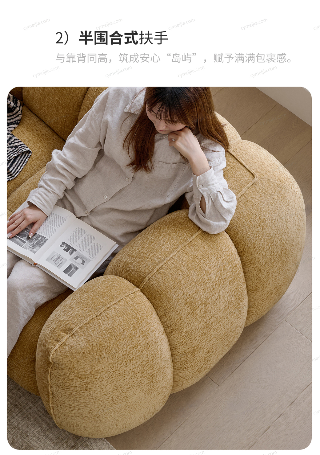 ☀ 半围合式扶手,与靠背同高,筑成安心“岛屿”,赋予满满包裹感。