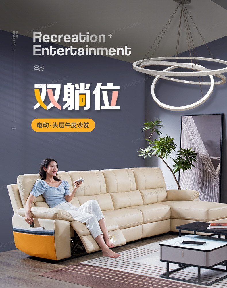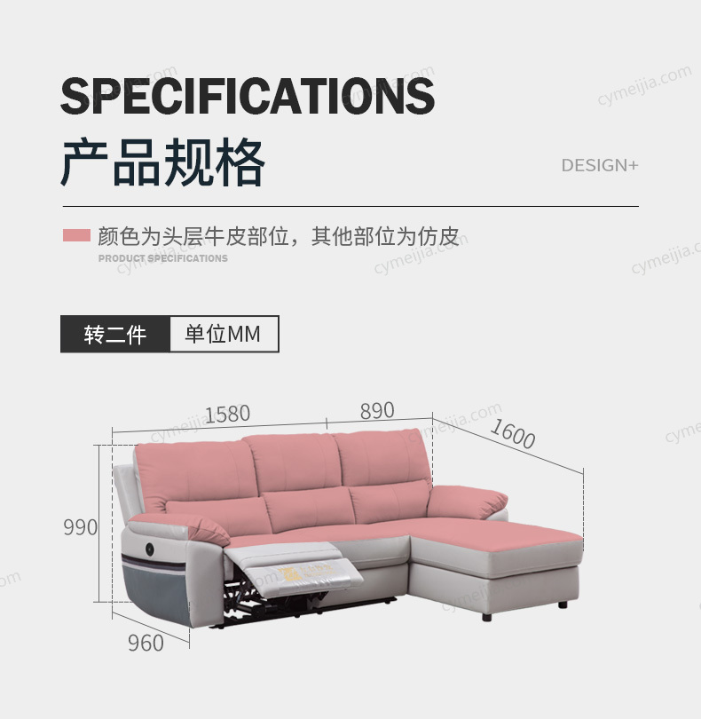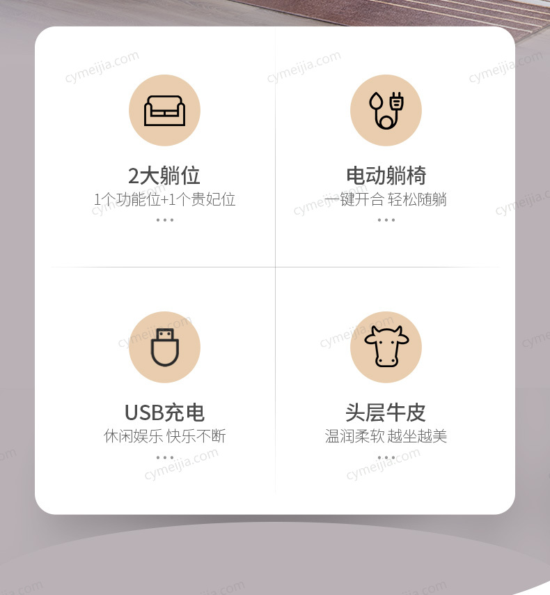 | 产品材质 : 接触面头层牛皮+松木框架+高密度海绵+公仔棉+功能铁架(转A电动带USB充电) | 包件数 : 2 | 包装体积(m3) : 2.60 | |