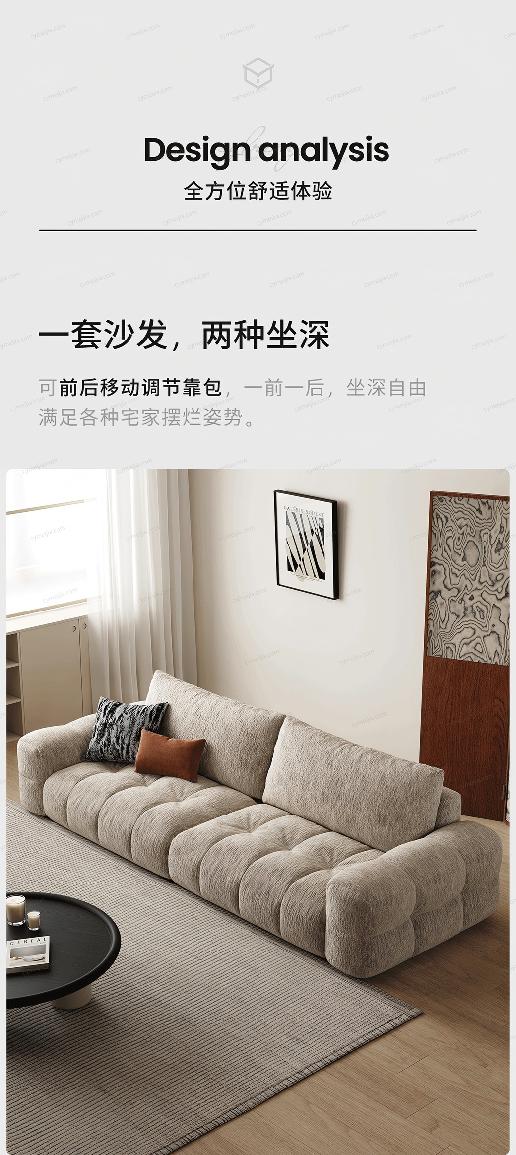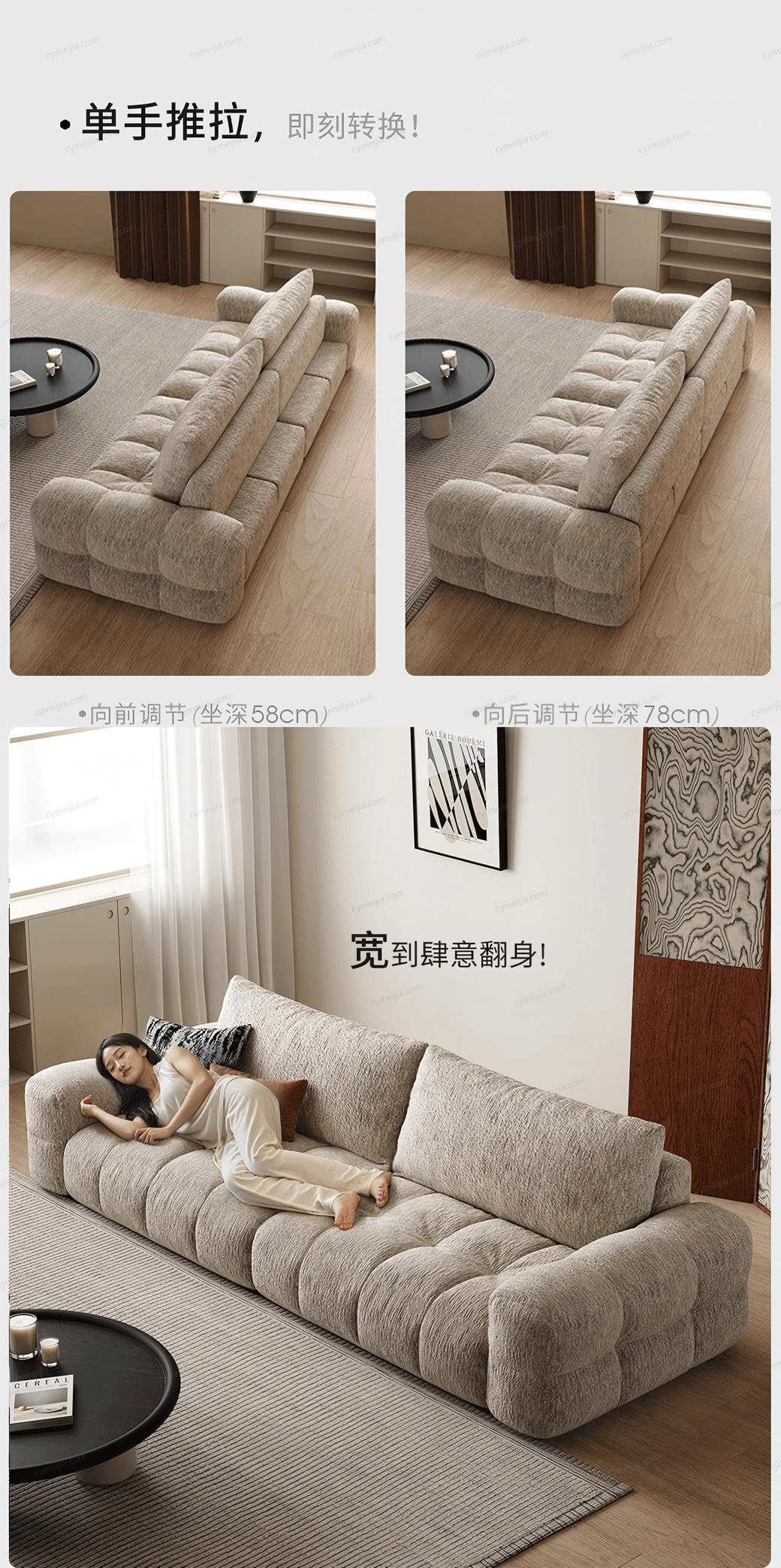 ☀ 靠包推拉秒变单人床:一套沙发两种坐深。可前后移动调节靠包,单手推拉秒变单人床,780mm超宽大坐深自由切换,满足各种宅家姿势。
