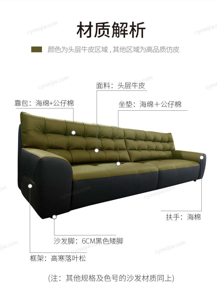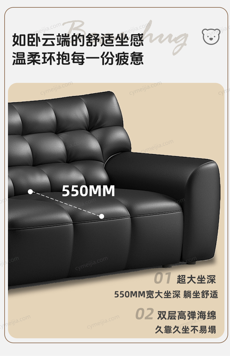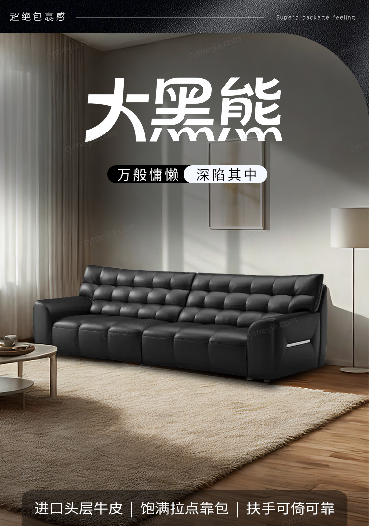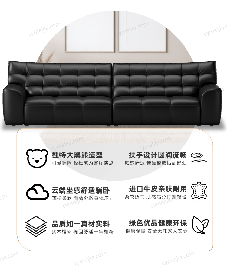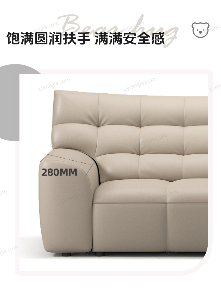 | 产品材质 : | 接触面进口头层牛皮+高弹海绵+公仔棉+高寒落叶松实木框架+E1级夹板 |