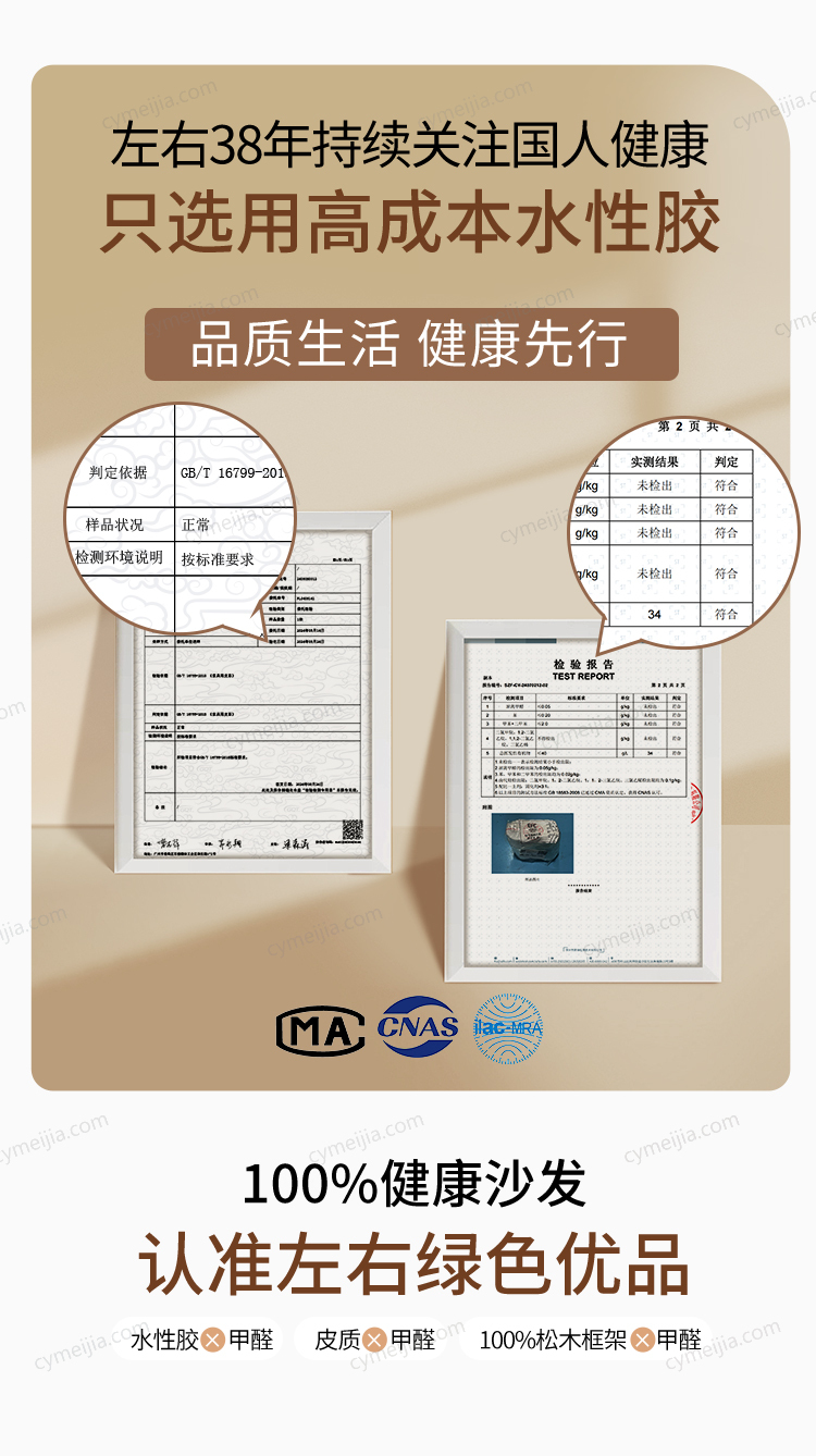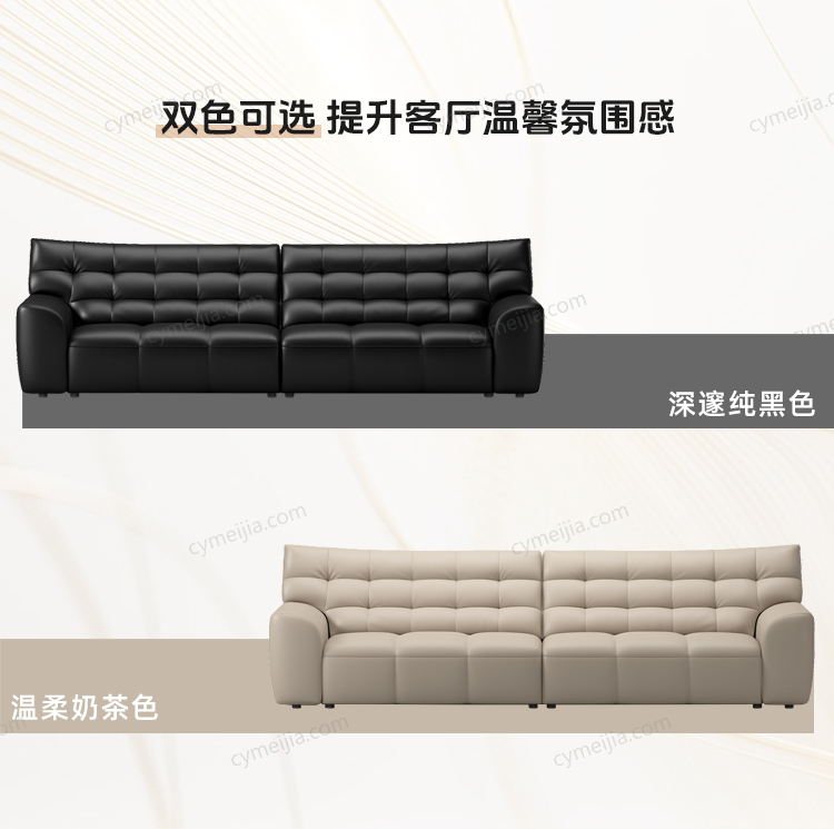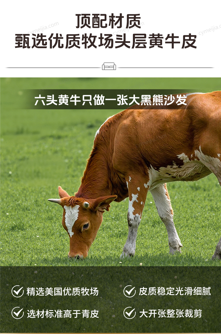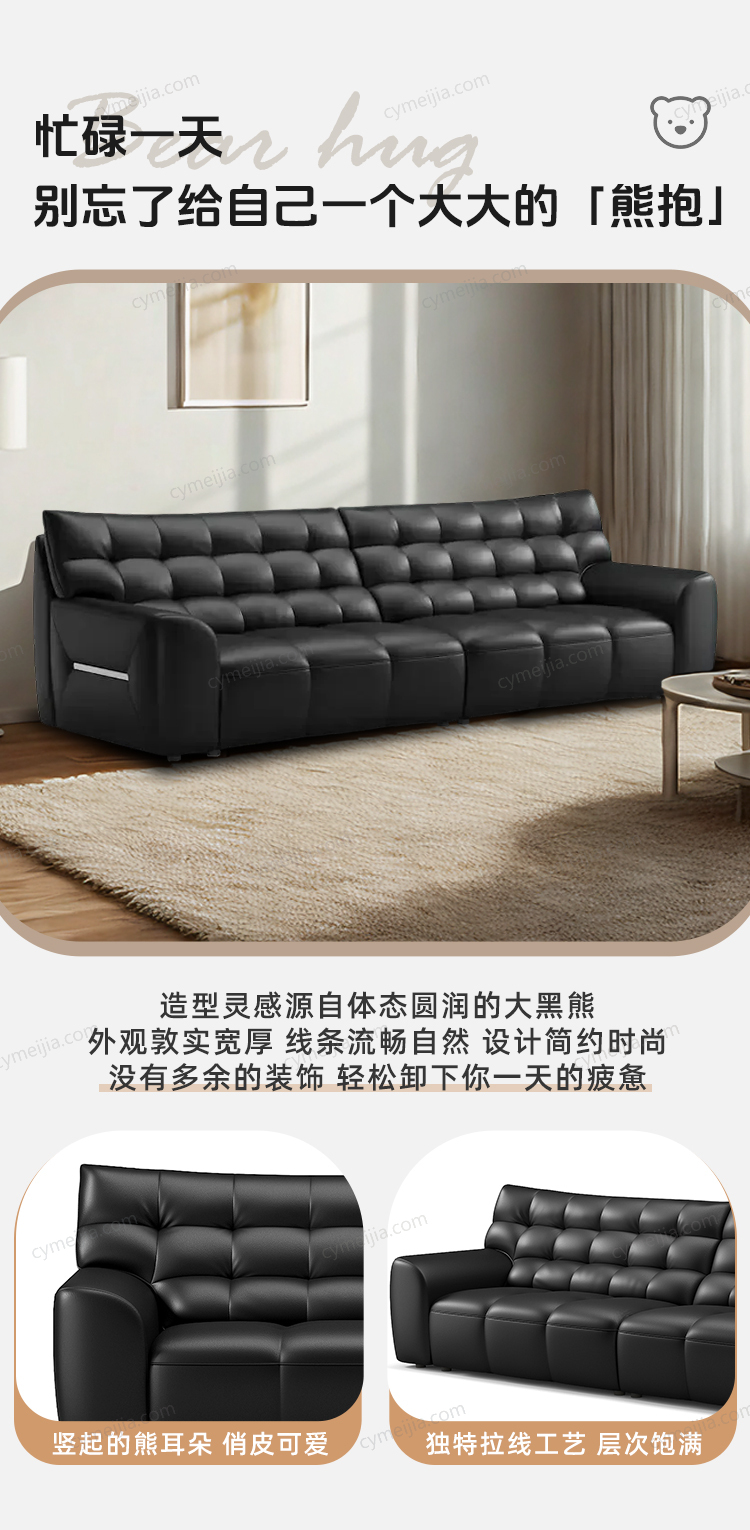 | 产品材质 : | 接触面进口头层牛皮+高弹海绵+公仔棉+高寒落叶松实木框架+E1级夹板 |