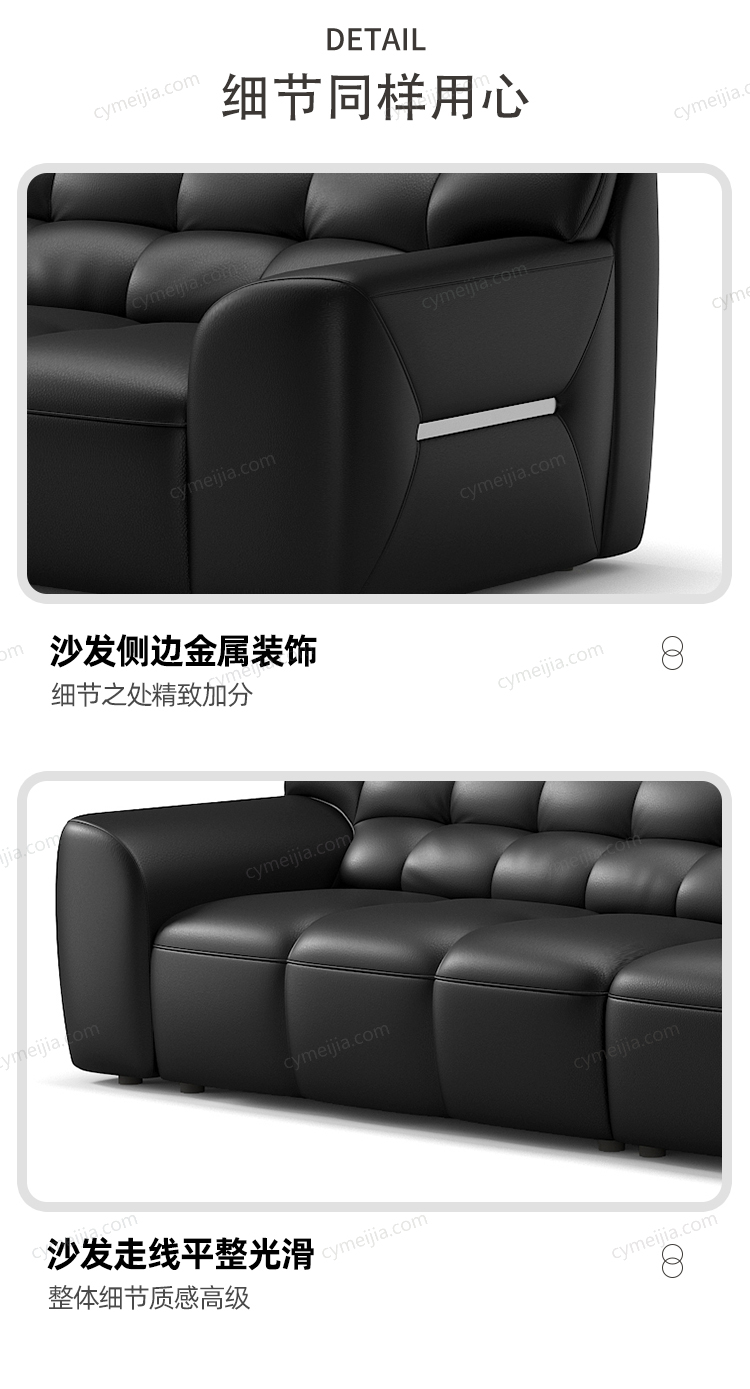 | 产品材质 : 接触面进口头层牛皮+高弹海绵+公仔棉+高寒落叶松实木框架+E1级夹板 | 包件数 : 2 | 包装体积(m3) : 2.40 | |