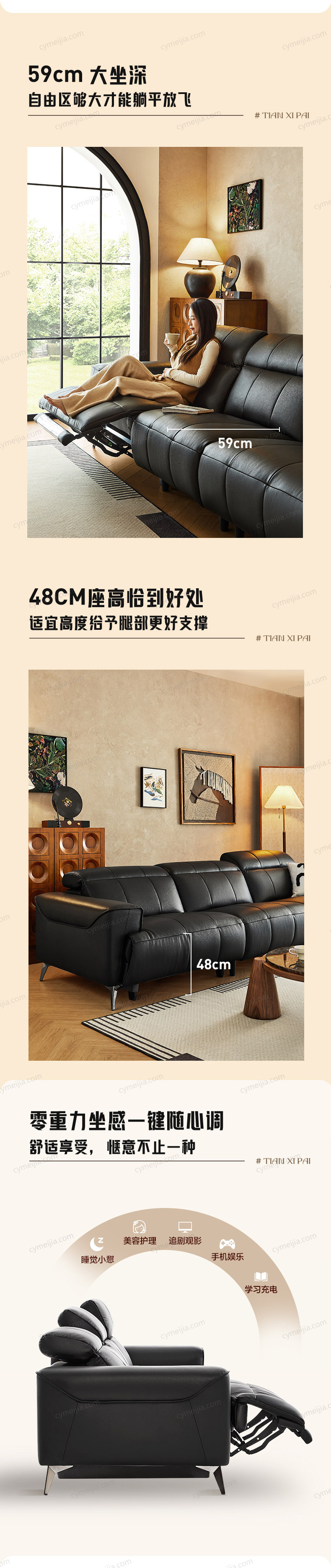 | 产品材质 : | 接触面进口头层牛皮+深坐感功能架+实木框架+usb充电插口+15mm加高枪色沙发脚+多层高回弹海绵 |