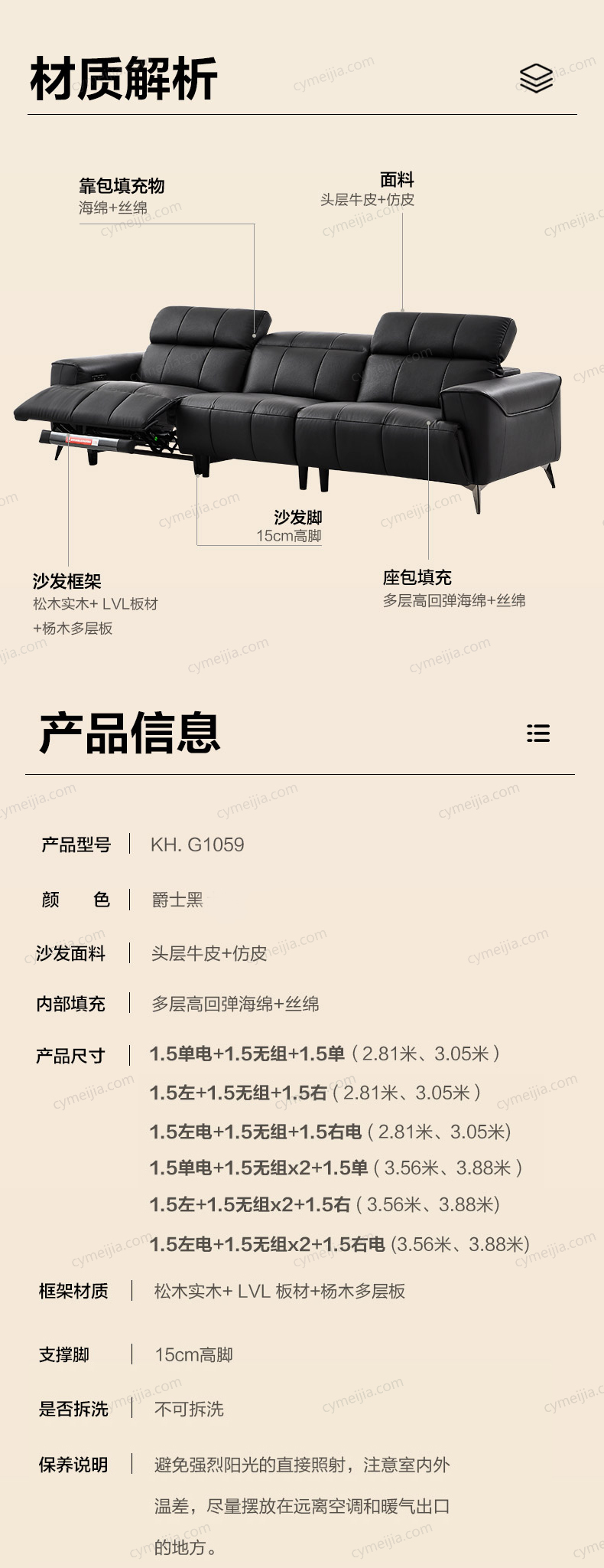 | 产品材质 : 接触面进口头层牛皮+深坐感功能架+实木框架+usb充电插口+15mm加高枪色沙发脚+多层高回弹海绵 | 包件数 : 2 | 包装体积(m3) : 3.34 | |