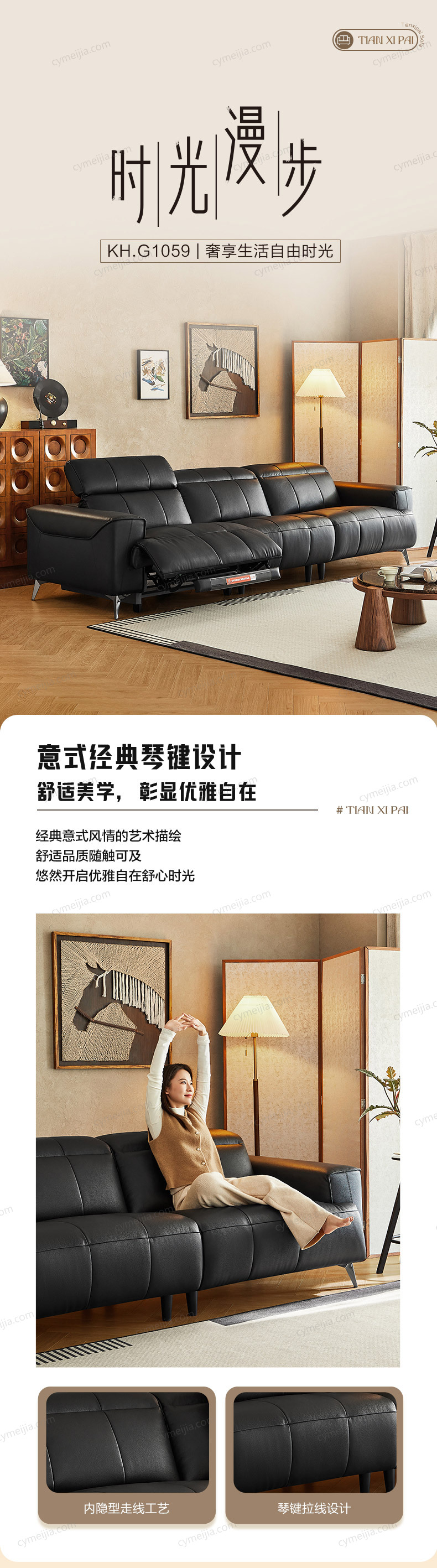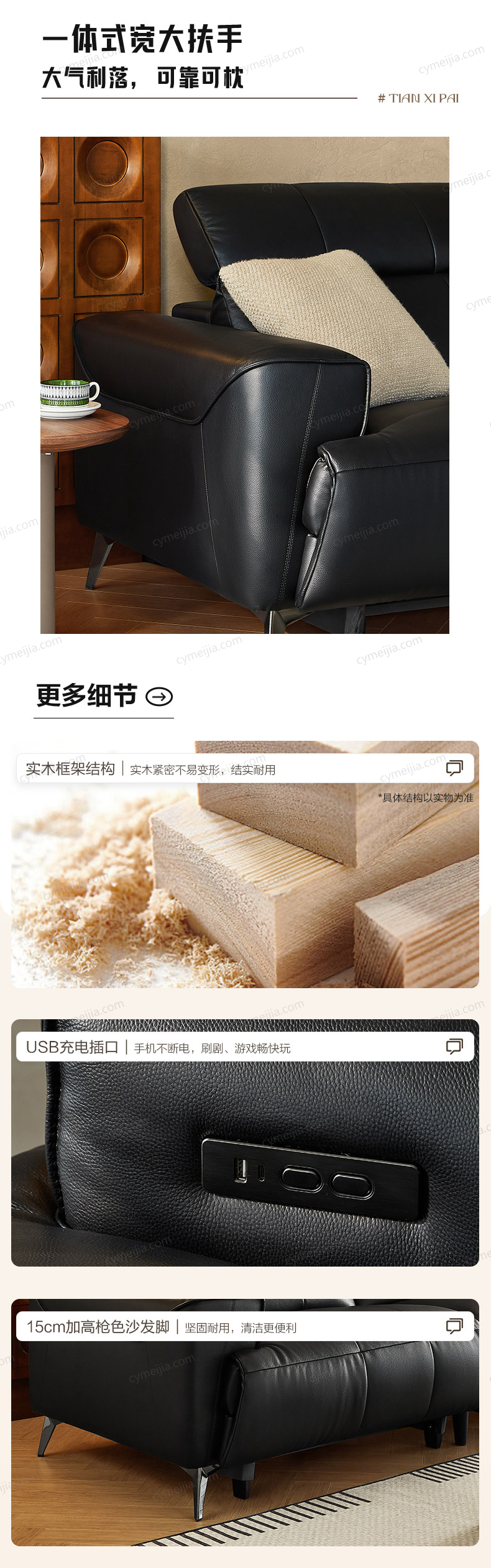 | 产品材质 : | 接触面进口头层牛皮+深坐感功能架+实木框架+usb充电插口+15mm加高枪色沙发脚+多层高回弹海绵 |