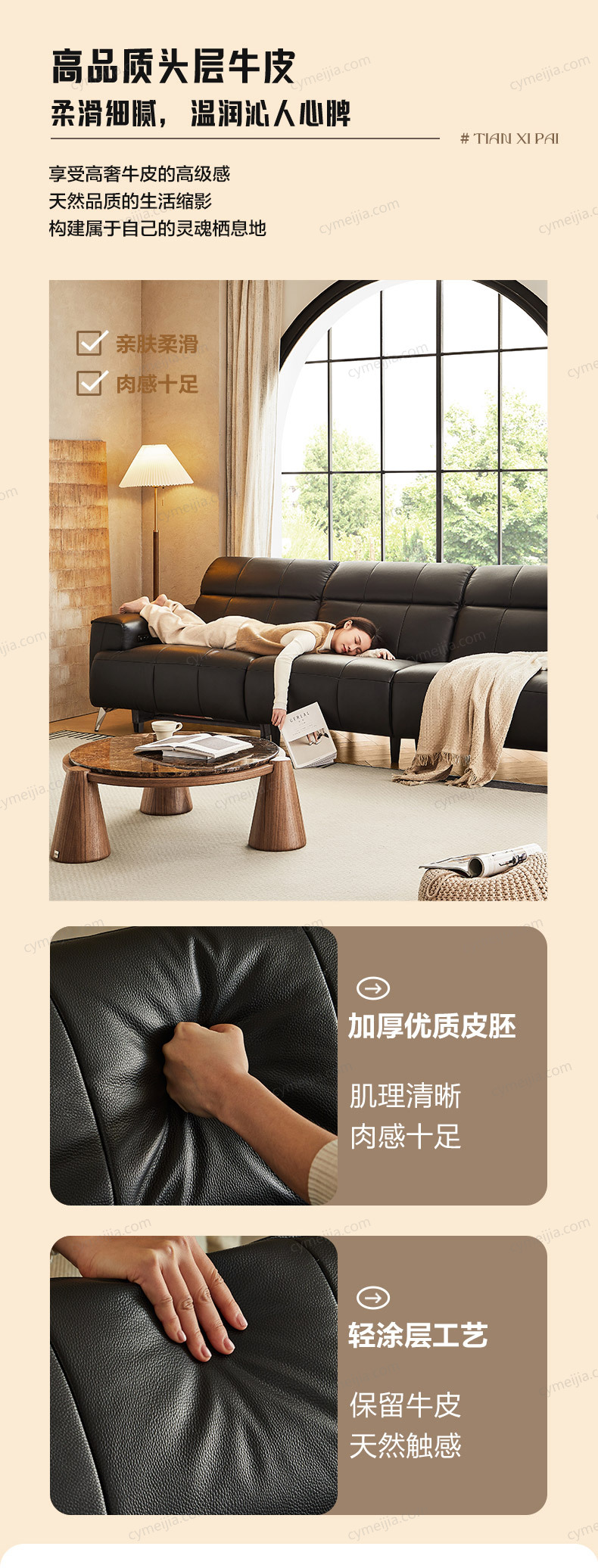 | 产品材质 : | 接触面进口头层牛皮+深坐感功能架+实木框架+usb充电插口+15mm加高枪色沙发脚+多层高回弹海绵 |