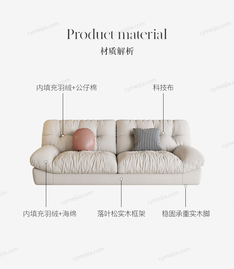 | 产品材质 : | 绒布+高密度海绵+俄罗斯落叶松实木框架+实木脚 |