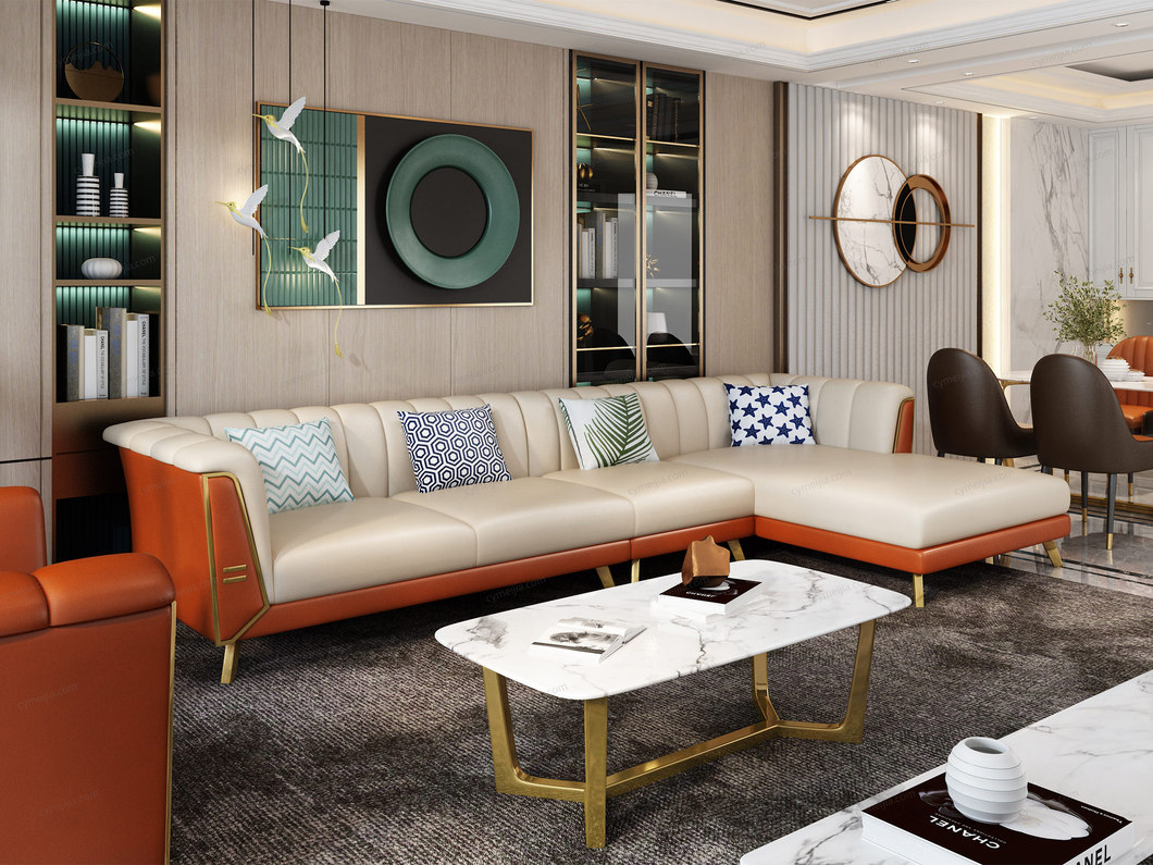 | 产品材质 : 底框架优质亮光加密仿皮+人体接触面优质亮光仿真皮+超纤皮(坐包面、坐包前、扶手面、靠背面)+抱枕涤棉布料填充A+太空棉+抛光实木内架(桉木为主)+蛇形弹簧+高弹力橡筋+高密度纯海绵+扶手镶钛金五金+可拆装镀金五金脚 | 包件数 : 3 | 包装体积(m3) : 2.34 | |