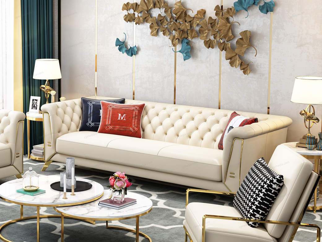 | 产品材质 : | 进口头层黄牛皮(接触面)+仿真皮(非接触面)+高密度海绵+俄罗斯落叶松实木框架+不锈钢镀金 |