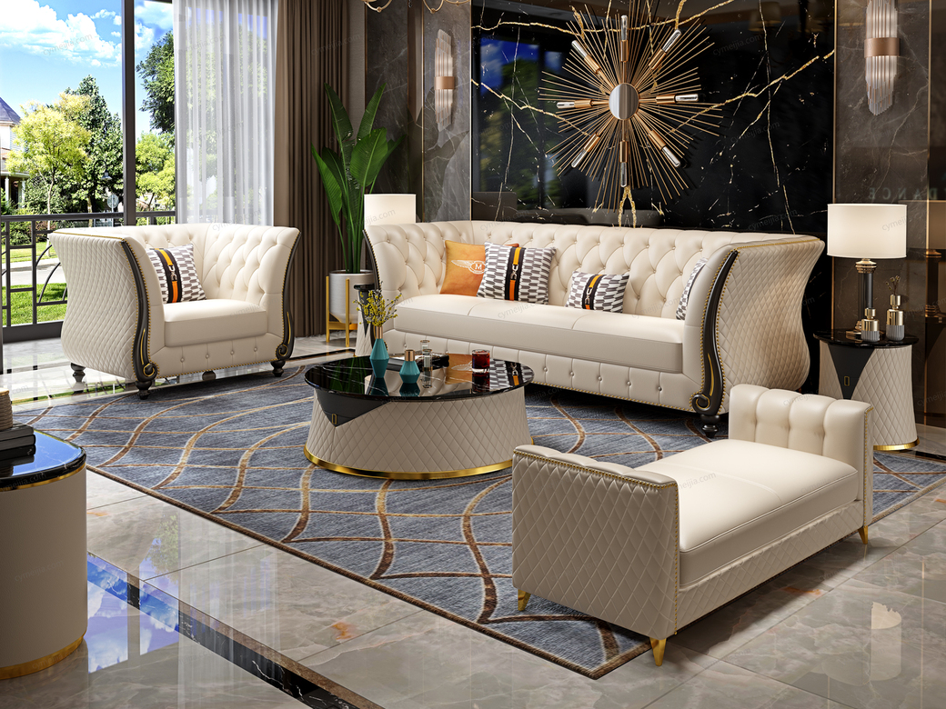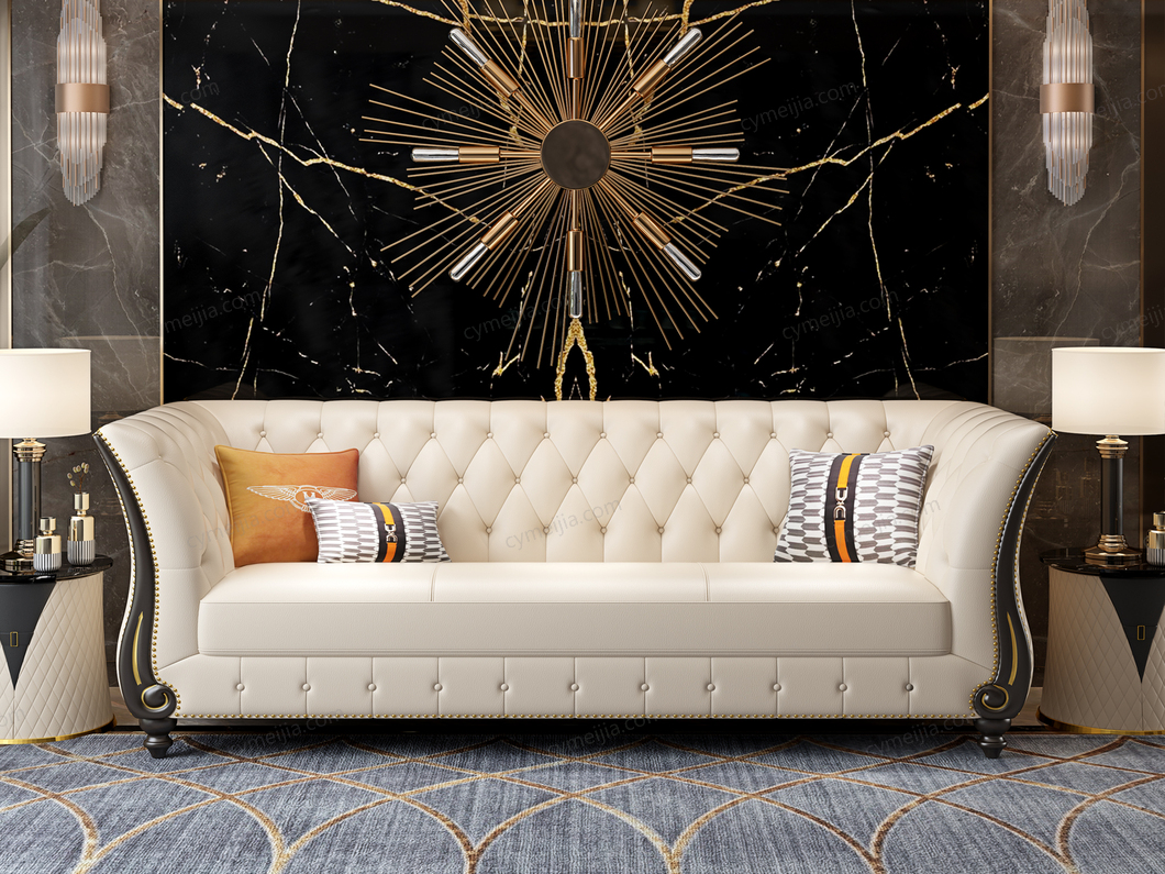 | 产品材质 : | 进口头层黄牛皮(接触面)+仿真皮(非接触面)+高密度海绵+俄罗斯落叶松实木框架+不锈钢镀金 |