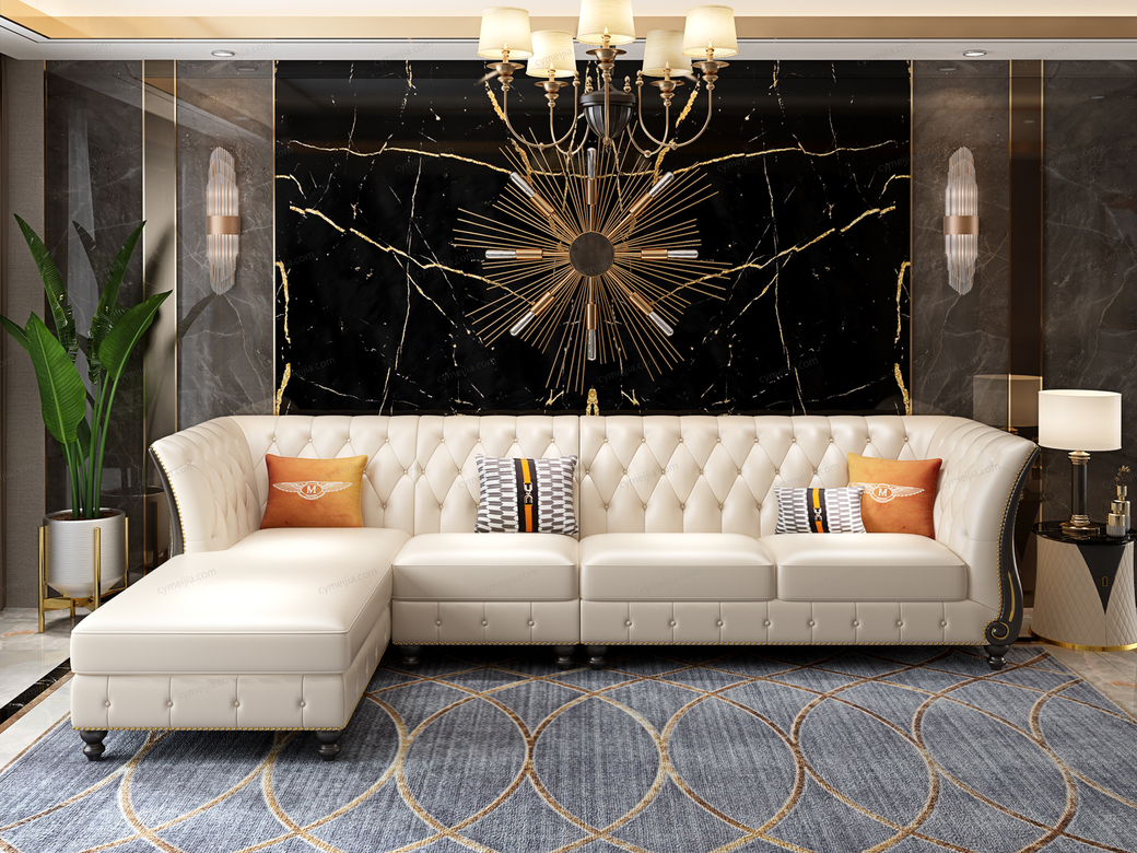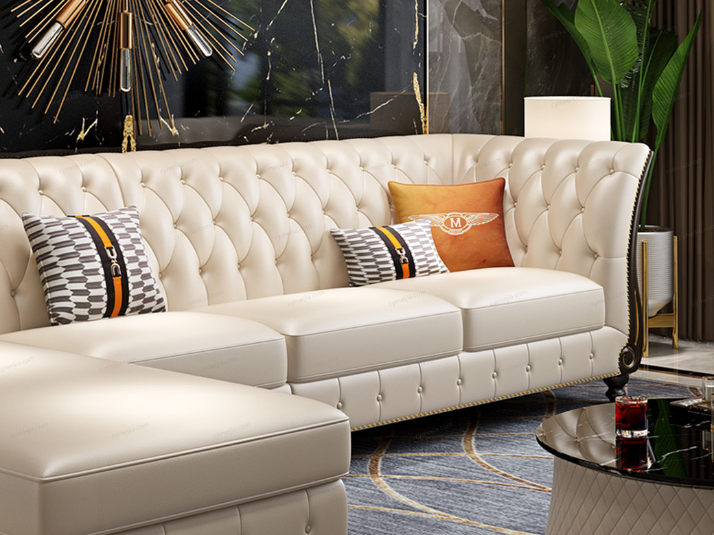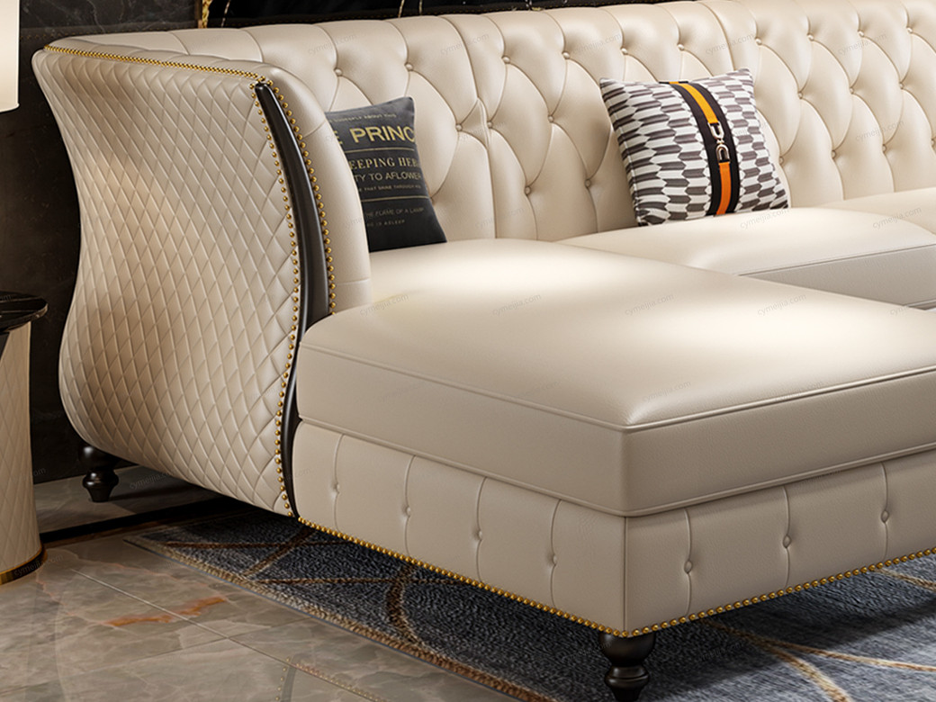 | 产品材质 : | 进口头层黄牛皮(接触面)+仿真皮(非接触面)+高密度海绵+俄罗斯落叶松实木框架+不锈钢镀金 |