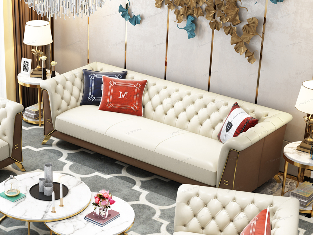 | 产品材质 : | 进口头层黄牛皮(接触面)+仿真皮(非接触面)+高密度海绵+俄罗斯落叶松实木框架+不锈钢镀金 |