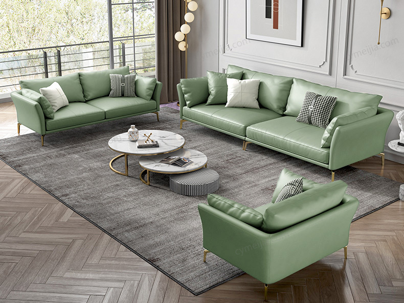 | 产品材质 : | 科技皮+九孔纤维绵扶手/靠包+高密度海绵座包+俄罗斯落叶松实木框架+金色防锈五金脚 |